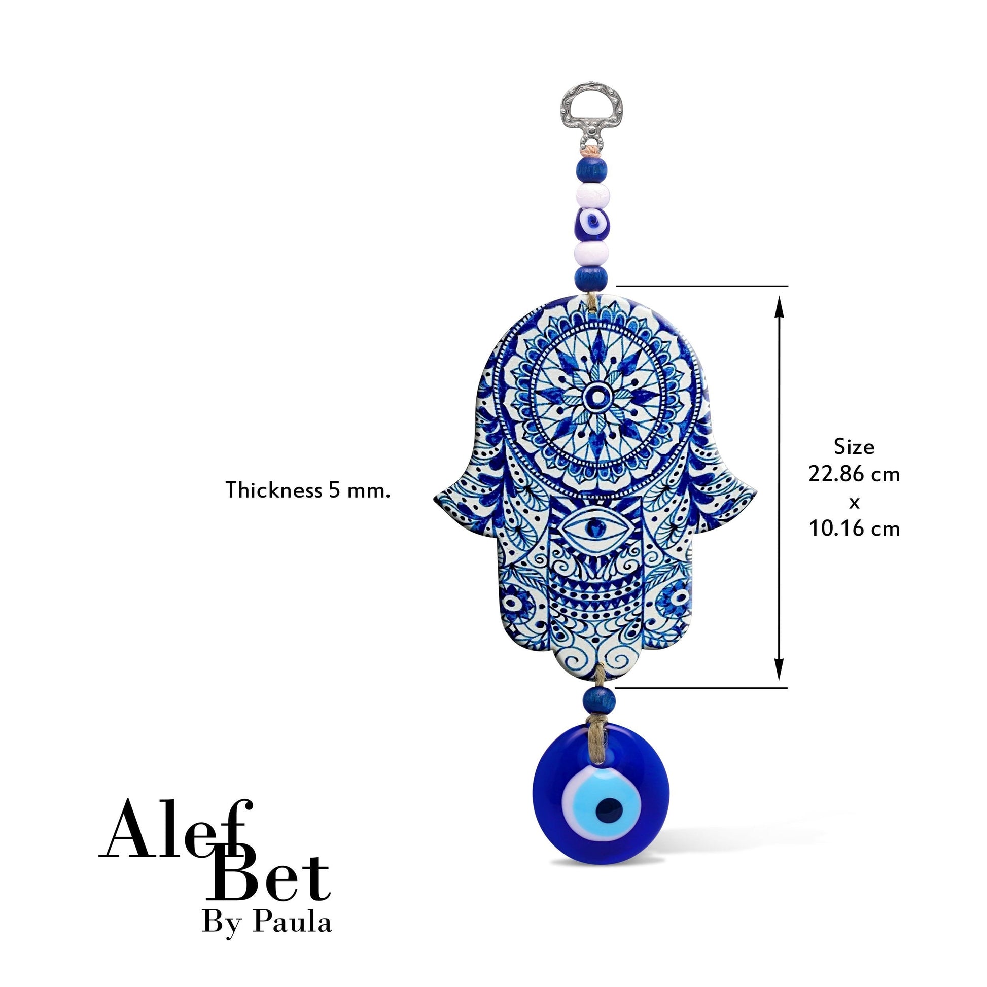 Vibrant blue chamsa has a lucky Nazar glass evil eye dangling from the finger, to watch over and protect you and all that reside in your home. Hamsa made from wood.