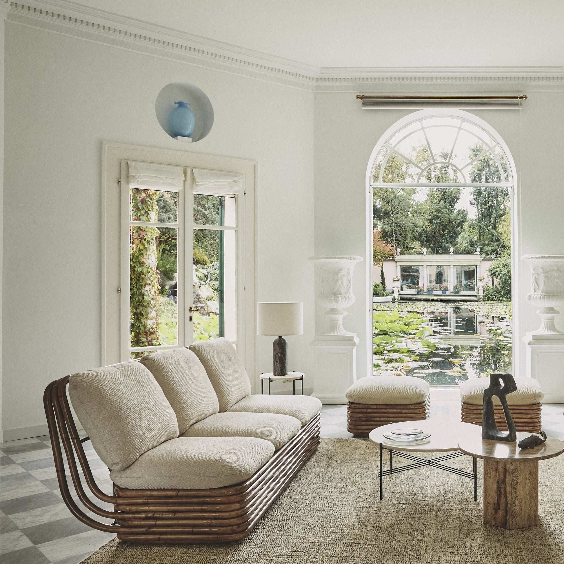 The Bohemian 72 Collection brings together Gabriella Crespi’s interest in natural materials, her fascination with stacked sculptural forms, and her curiosity about Eastern cultures and philosophies, honed over years of travel. During her lifetime, these exclusive pieces were only ever produced for private clients, but today, 50 years after they were first conceived, in the year she would have turned 100, GUBI has worked from Crespi’s original drawings to bring an extraordinary collection of iconic furniture designs into production for the first time. In the Bohemian 72 Collection, GUBI has distilled Crespi’s vision of a versatile furniture family for her house of the sun, conjuring a worldly Milanese sophistication from one of nature’s most humble-seeming materials. Elegant, flexible, and refined, the collection is the pinnacle of the jet-set bohemian lounge lifestyle. Alongside the ‘Rising Sun’ and ‘Five Positions’ Collections, the Bohemian 72 Collection was part of Crespi’s wider ‘Bamboo Collection’, designed between 1972 and 1975, and encompassing a broad range of natural materials such as manao, malacca and manila canes, and woven wicker and straw. Comprising a lounge chair, three-seater sofa, ottoman and floor lamp – all crafted from rattan – the Bohemian 72 Collection embodies Crespi’s career-long aim to create furniture that seamlessly unites indoor and outdoor living. She never allowed curtains or screens to block the natural flow of light or air and had what her daughter has described as ‘a deep sentiment for the cosmic energy of nature’.