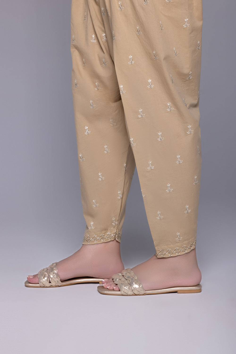 This ready to wear beige shalwar is a classic addition to summer wardrobe. Rendered in cambric fabric for every day use.