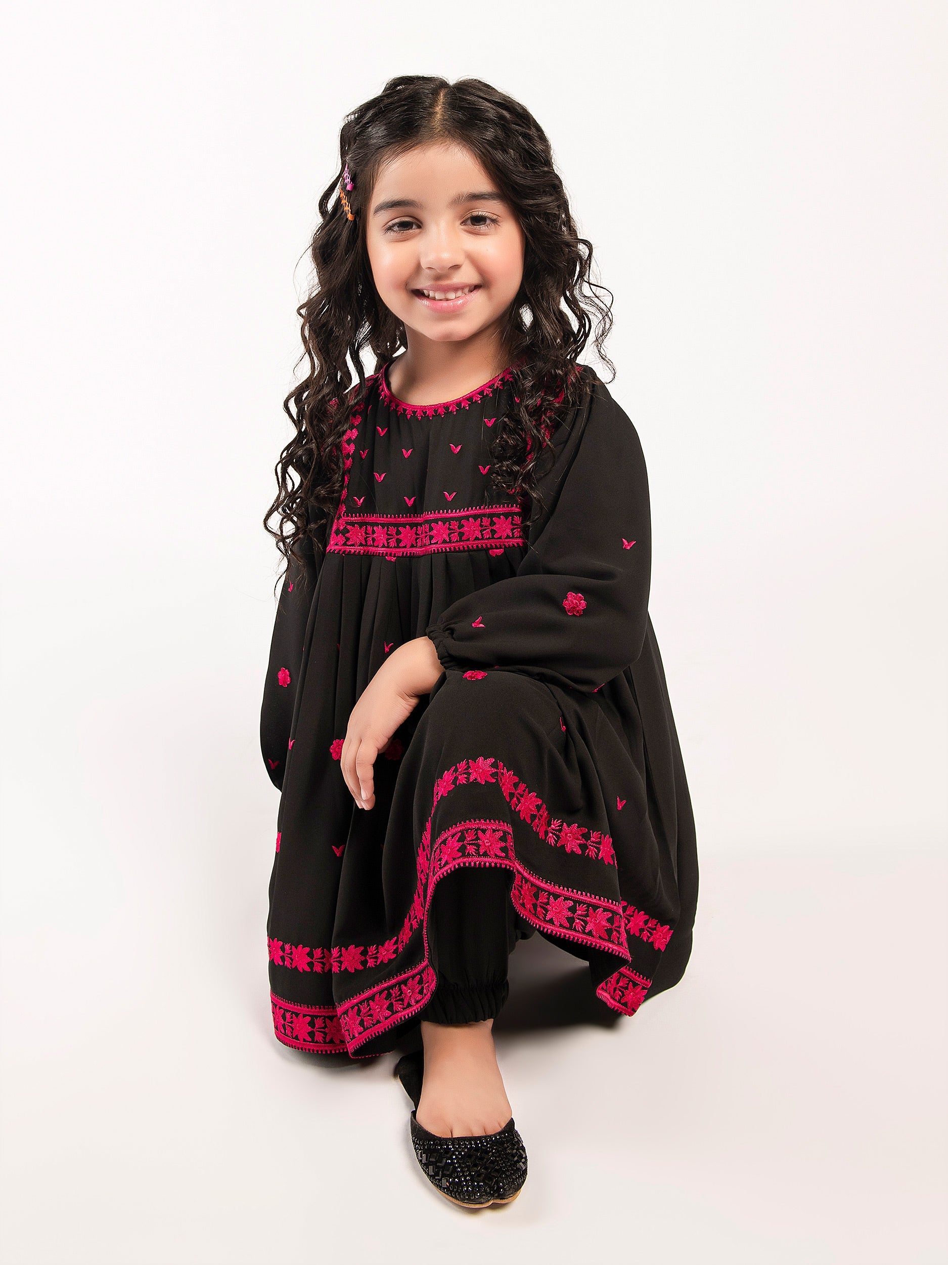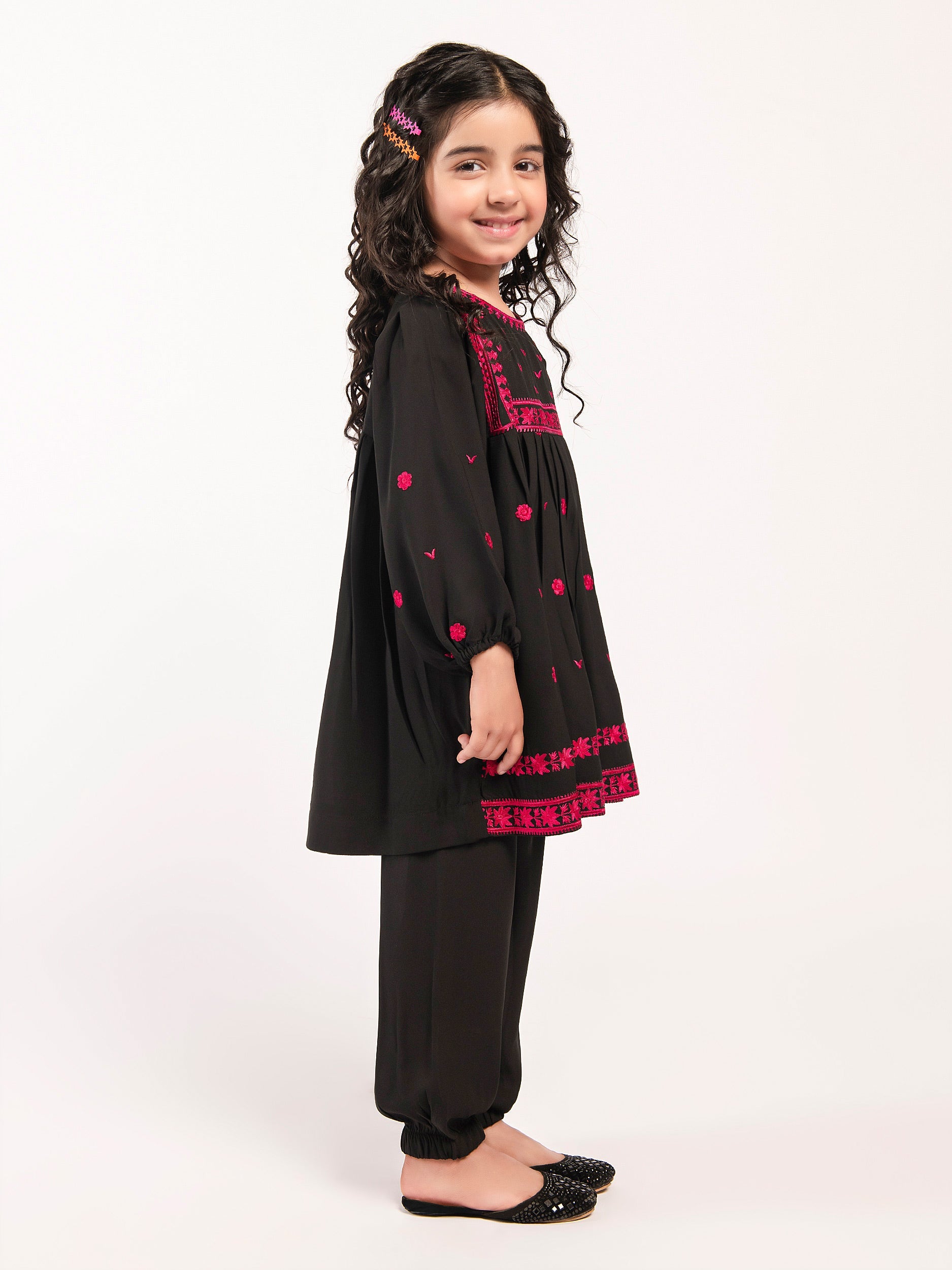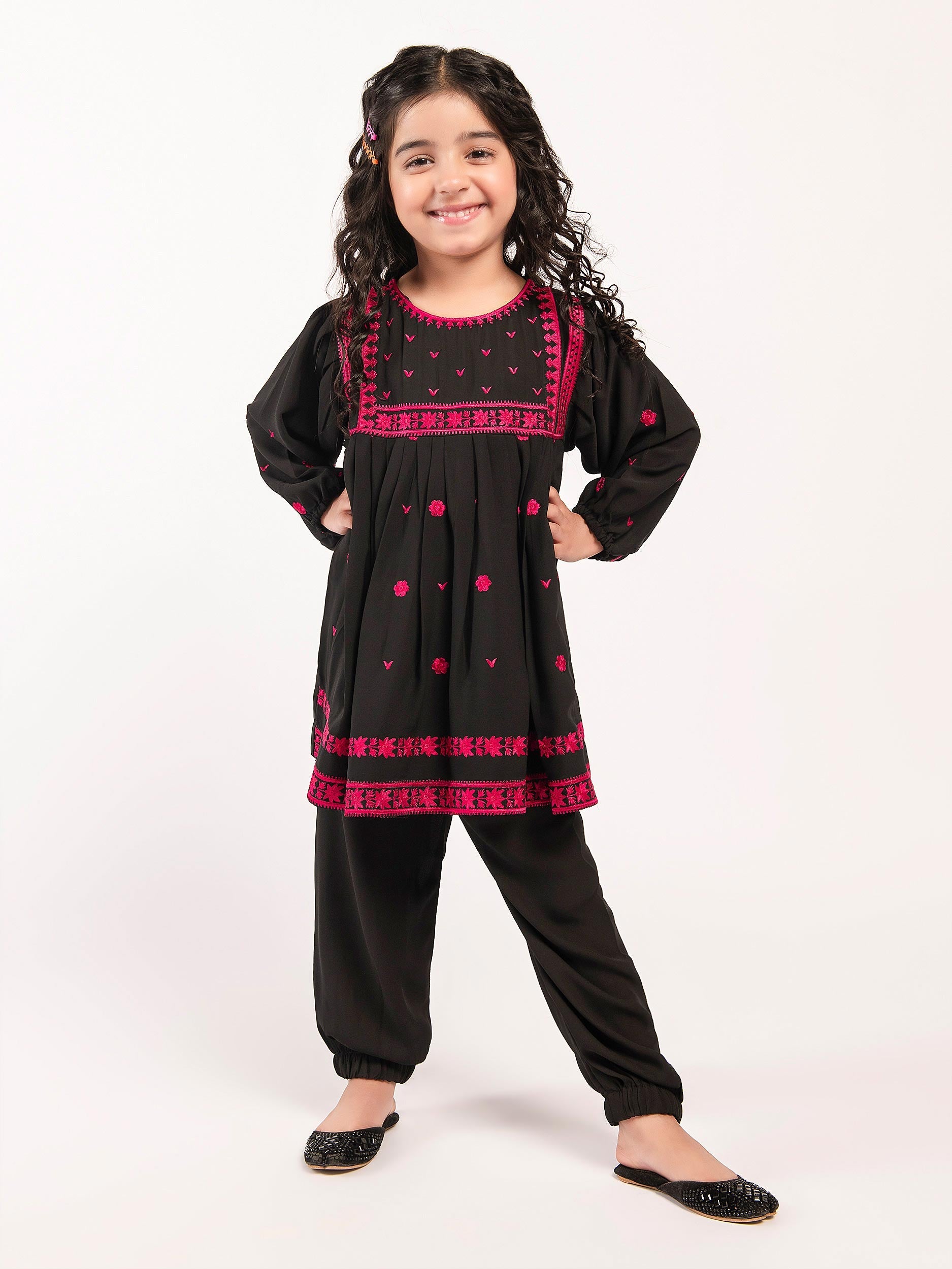 - Shocking pink embroidery on the front and full sleeves