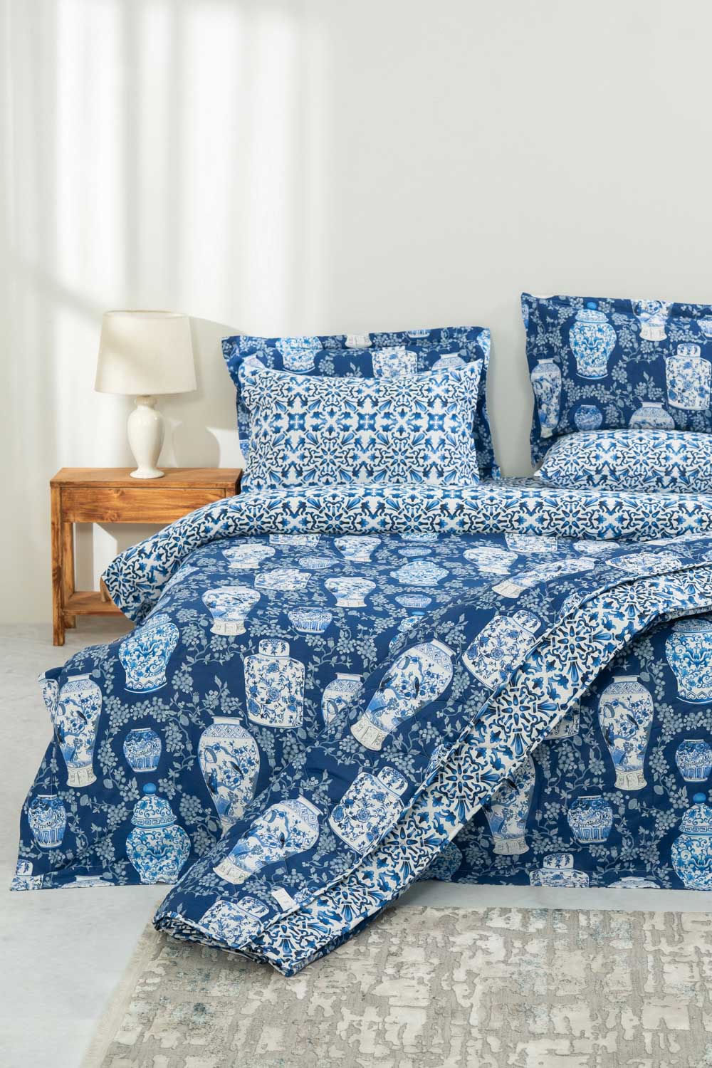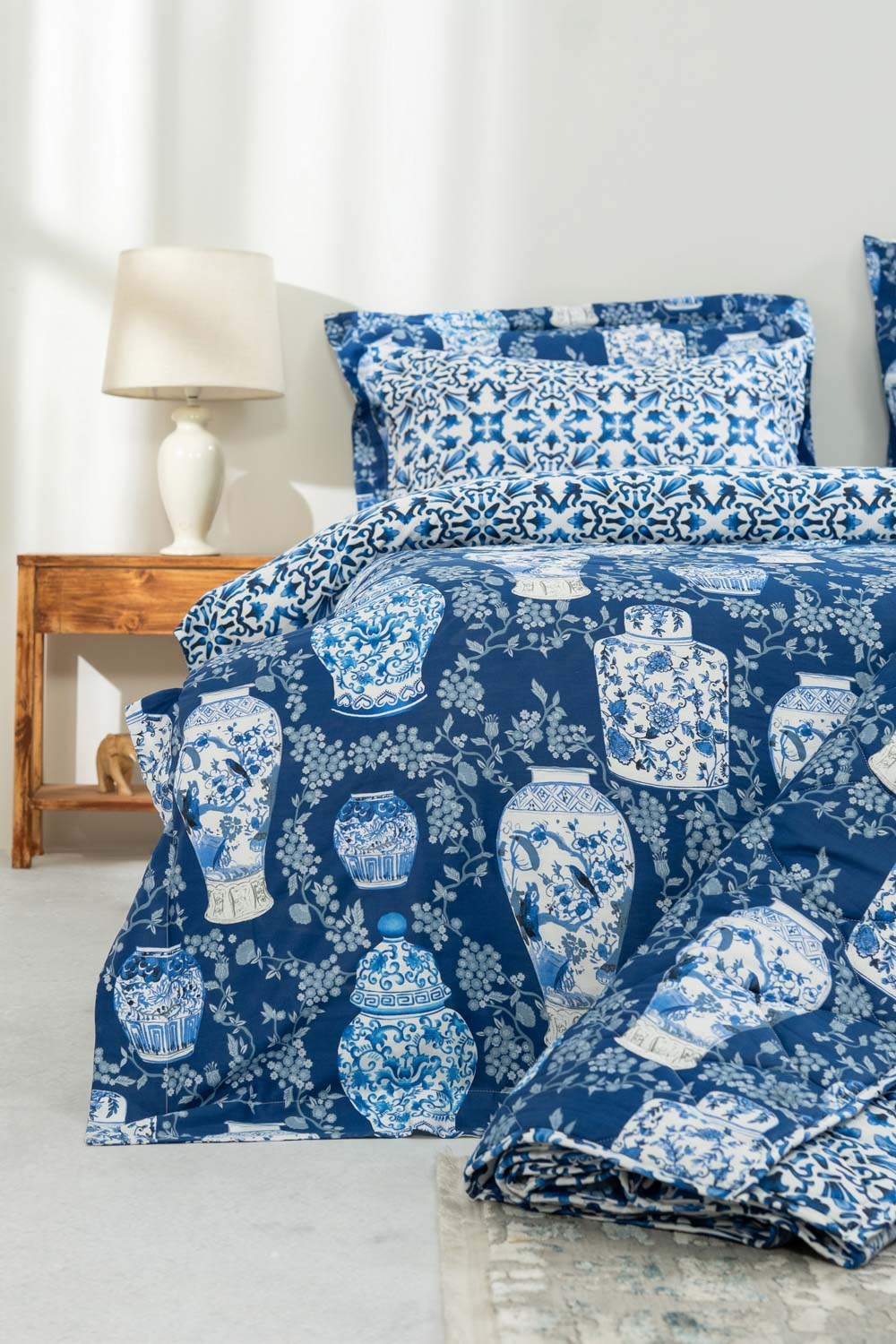 A rich blue bed spread with exquisite China pottery print is bound to elevate your room's look.
