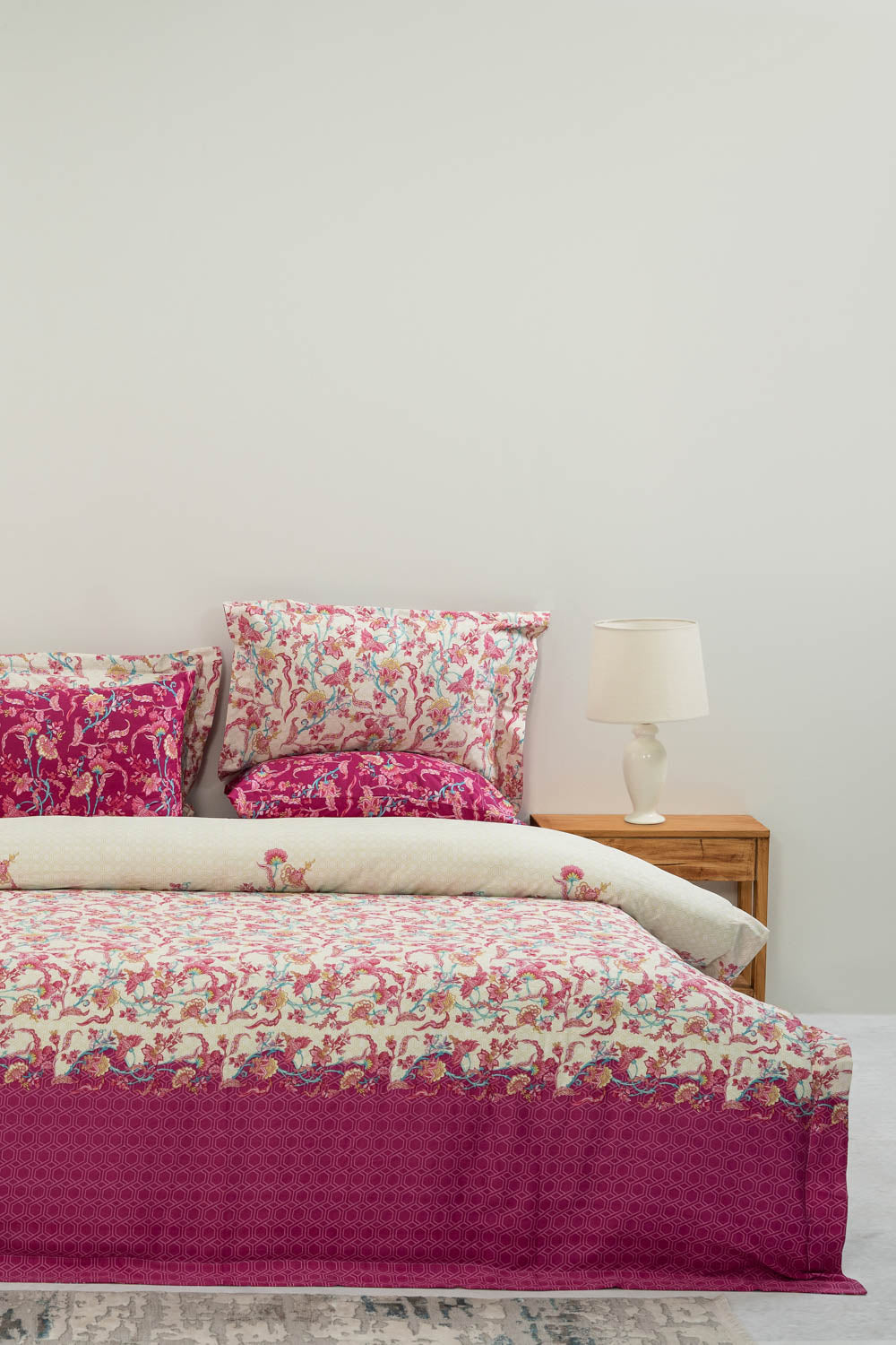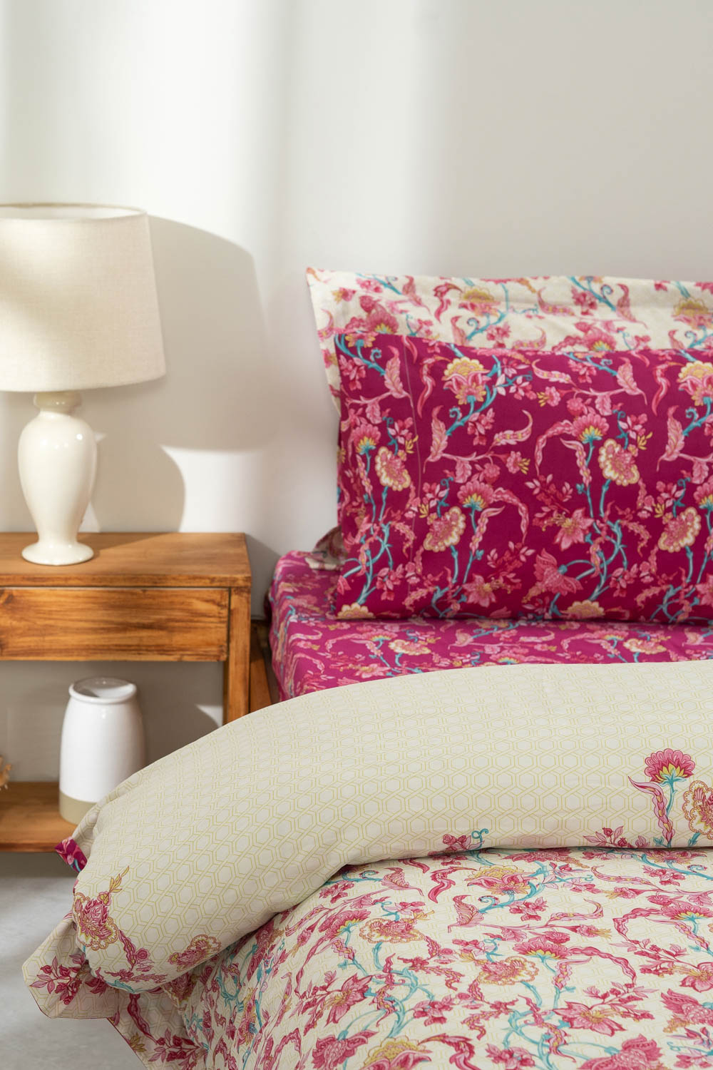 Brighten up your room with this sun-kissed quilt cover imbued in a pink hue with Jacobean print.