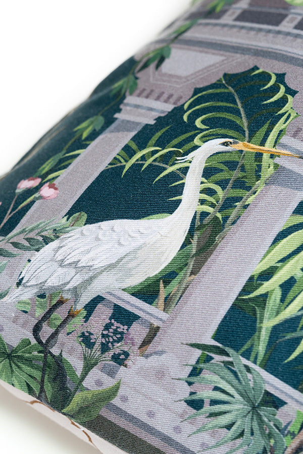 Add whimsy to your space with this tropical printed cushion featuring swans in a multicolor hue.