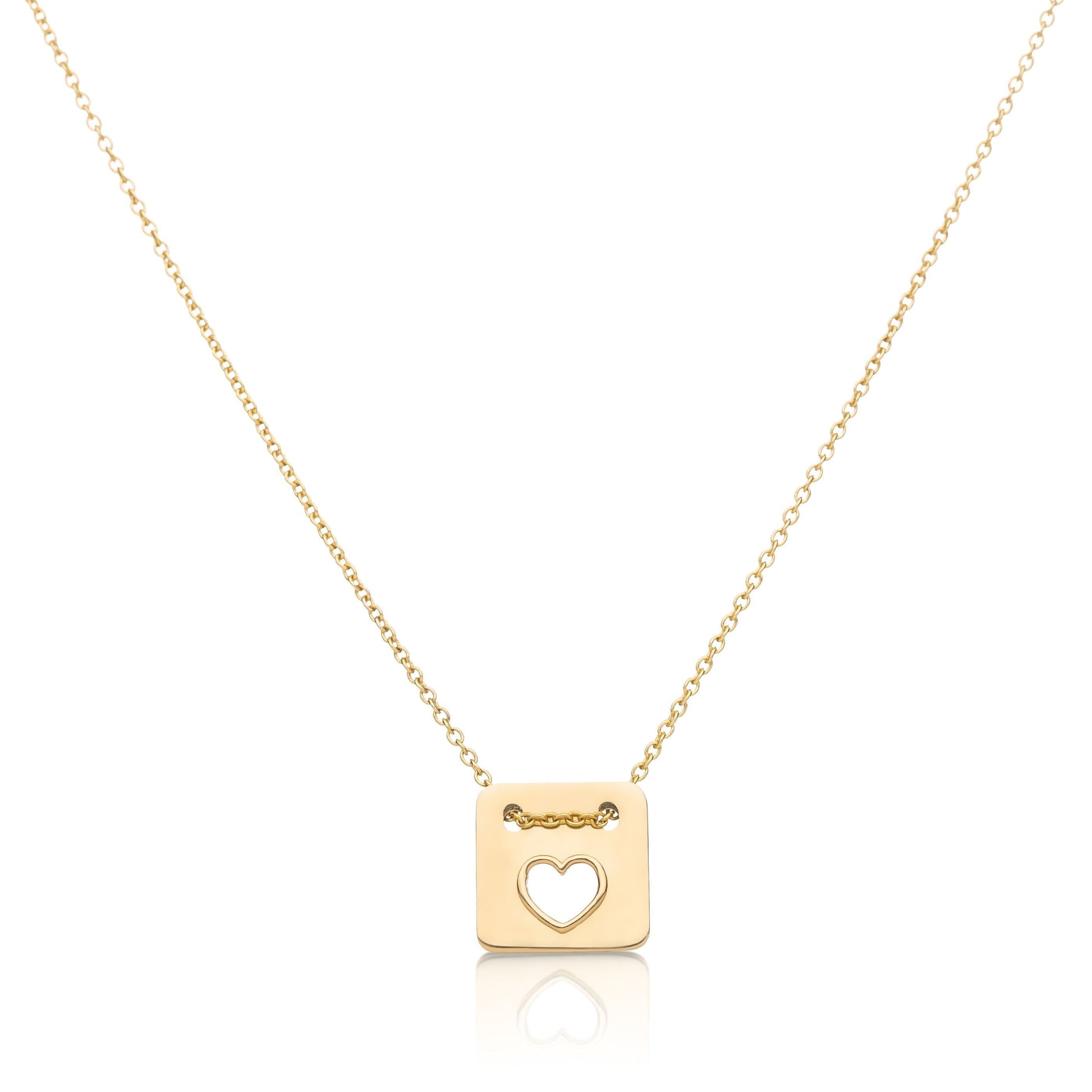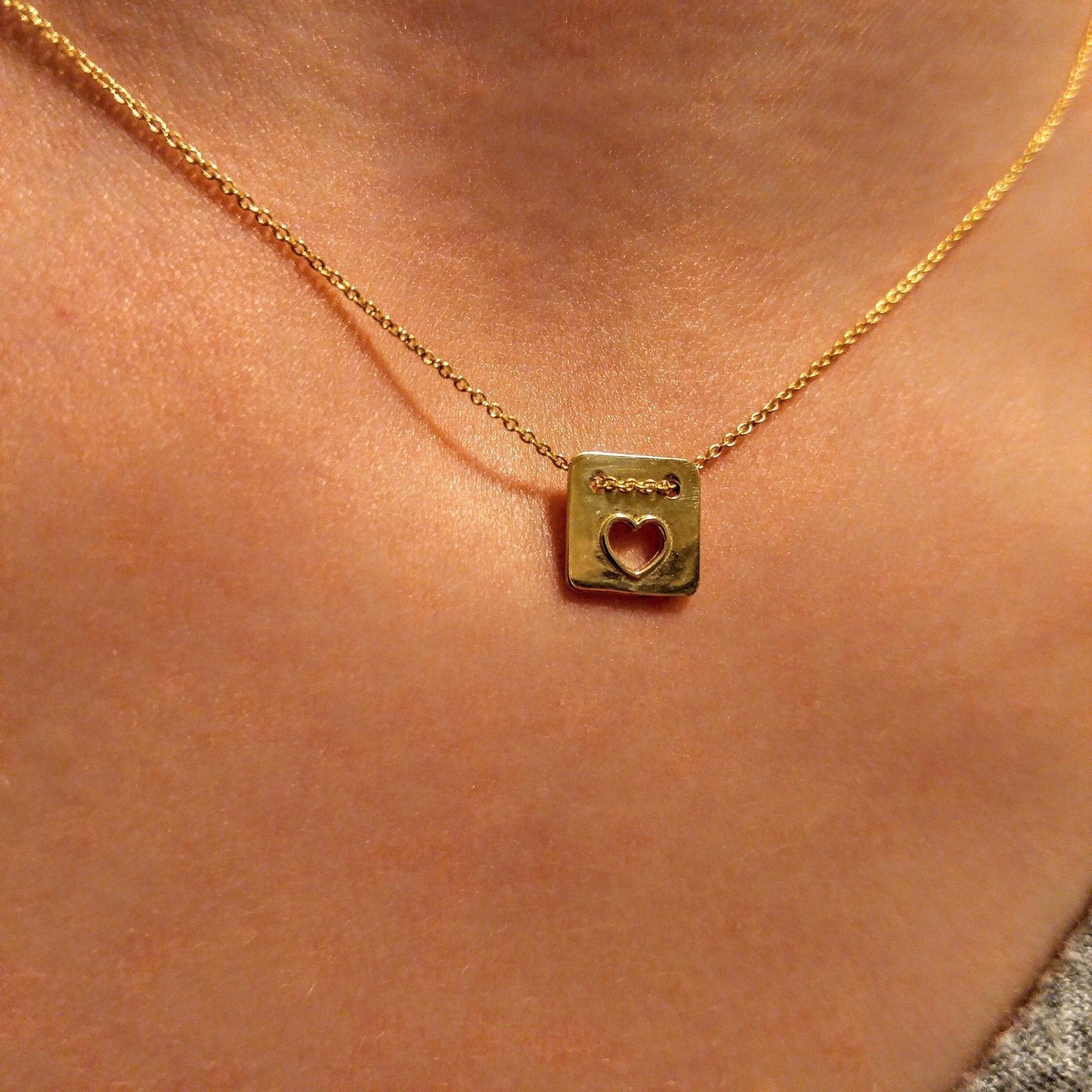 A tiny 14 karat, yellow gold square opens its heart, literally. A sweet heart shape is carved out of the center of the square pendant, making this the perfect gift for a daughter, a Bat Mitzvah, a mother, a sister, a BFF, a first crush (we encourage men to learn early in life how to buy fine jewelry!), or a cherished bubbeleh.