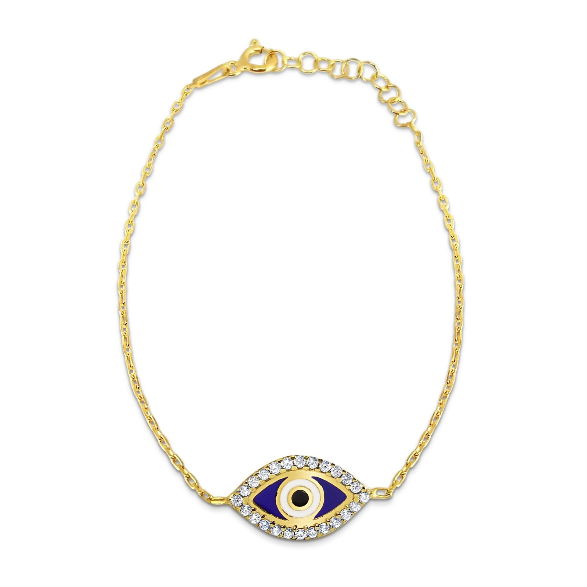 Sterling silver or 14k yellow gold vermeil evil eye bracelet to wear for protection, good luck, and style. Lucky blue coloring inside of the eye encourages good fortune.