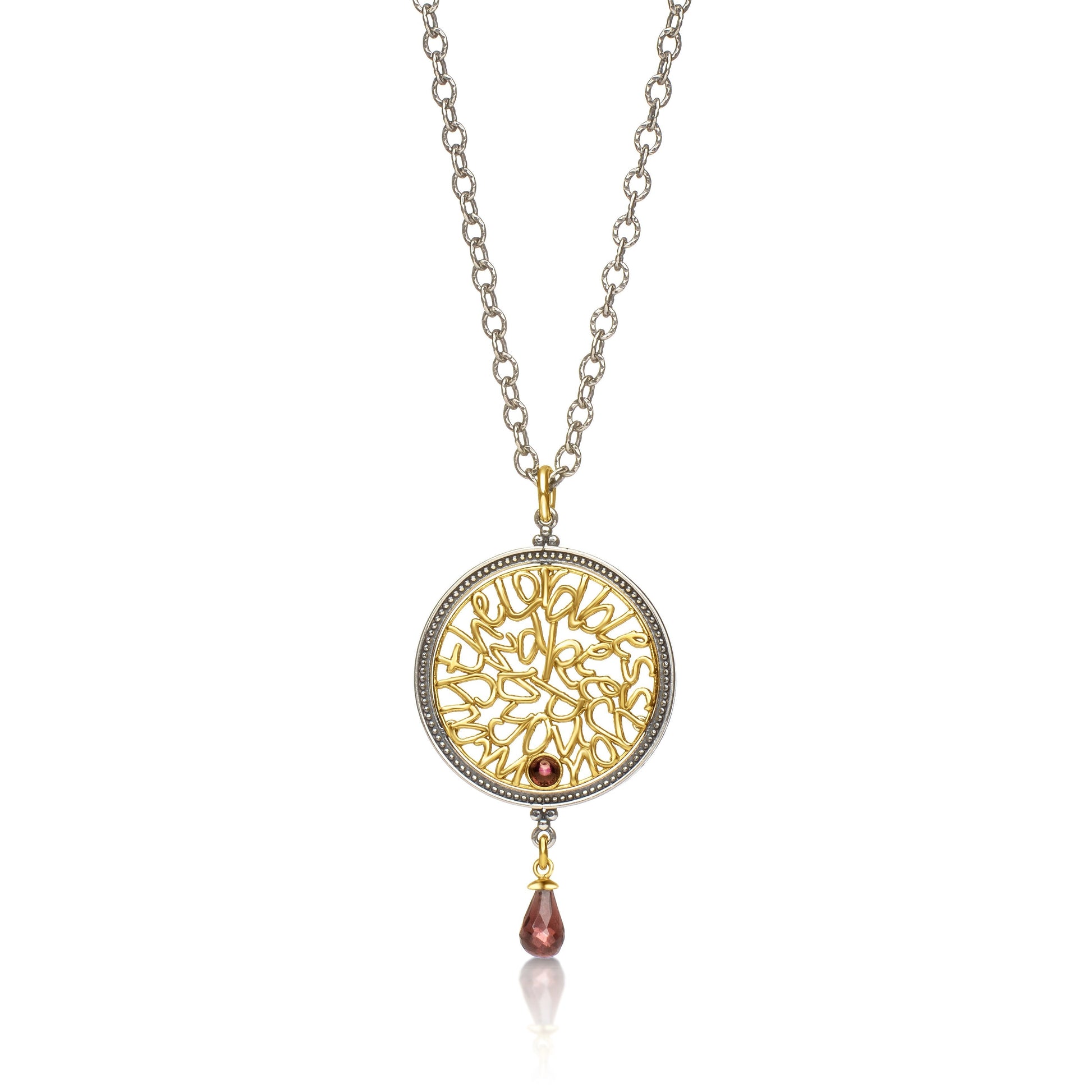 - A garnet briolette gemstone dangles from the charm