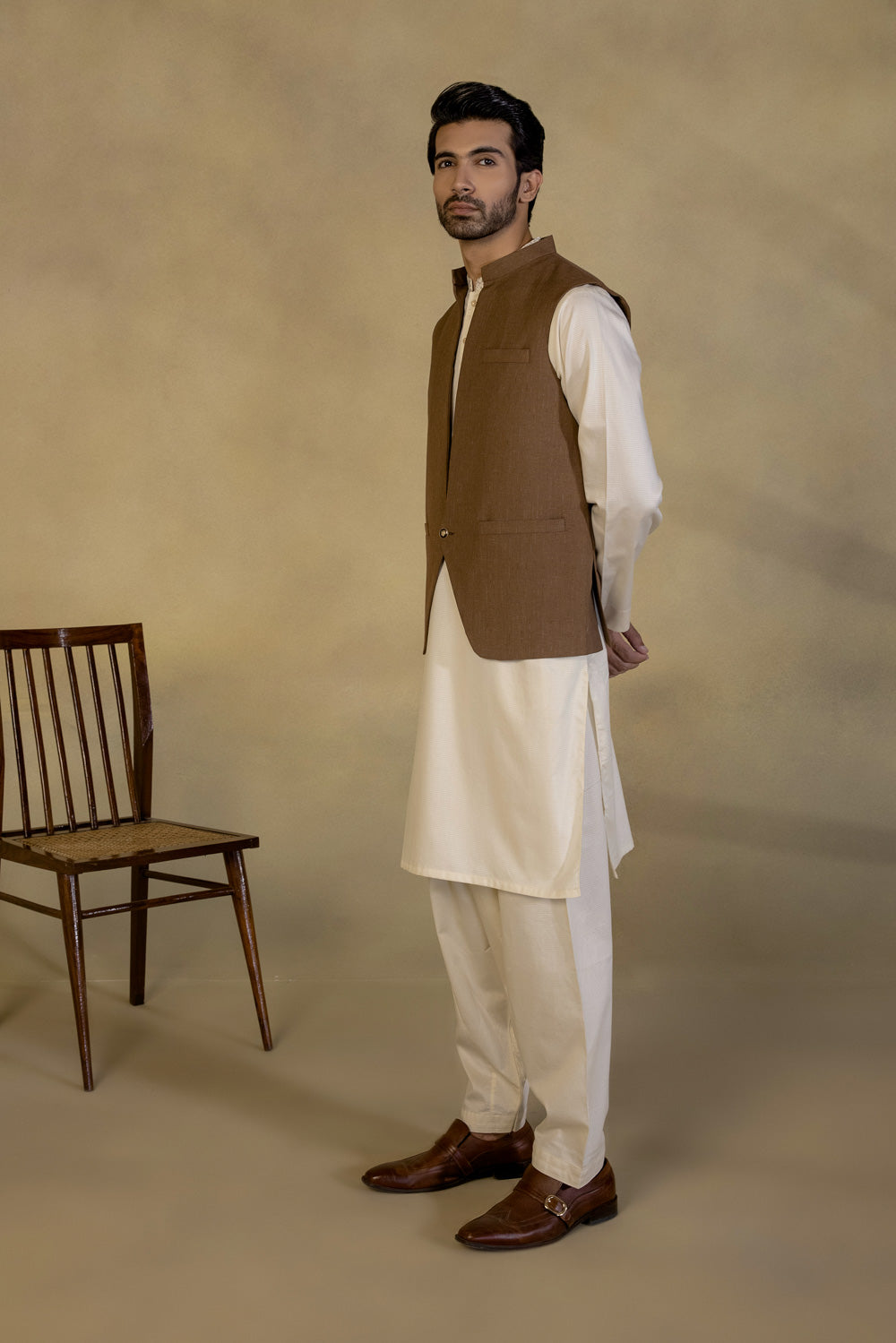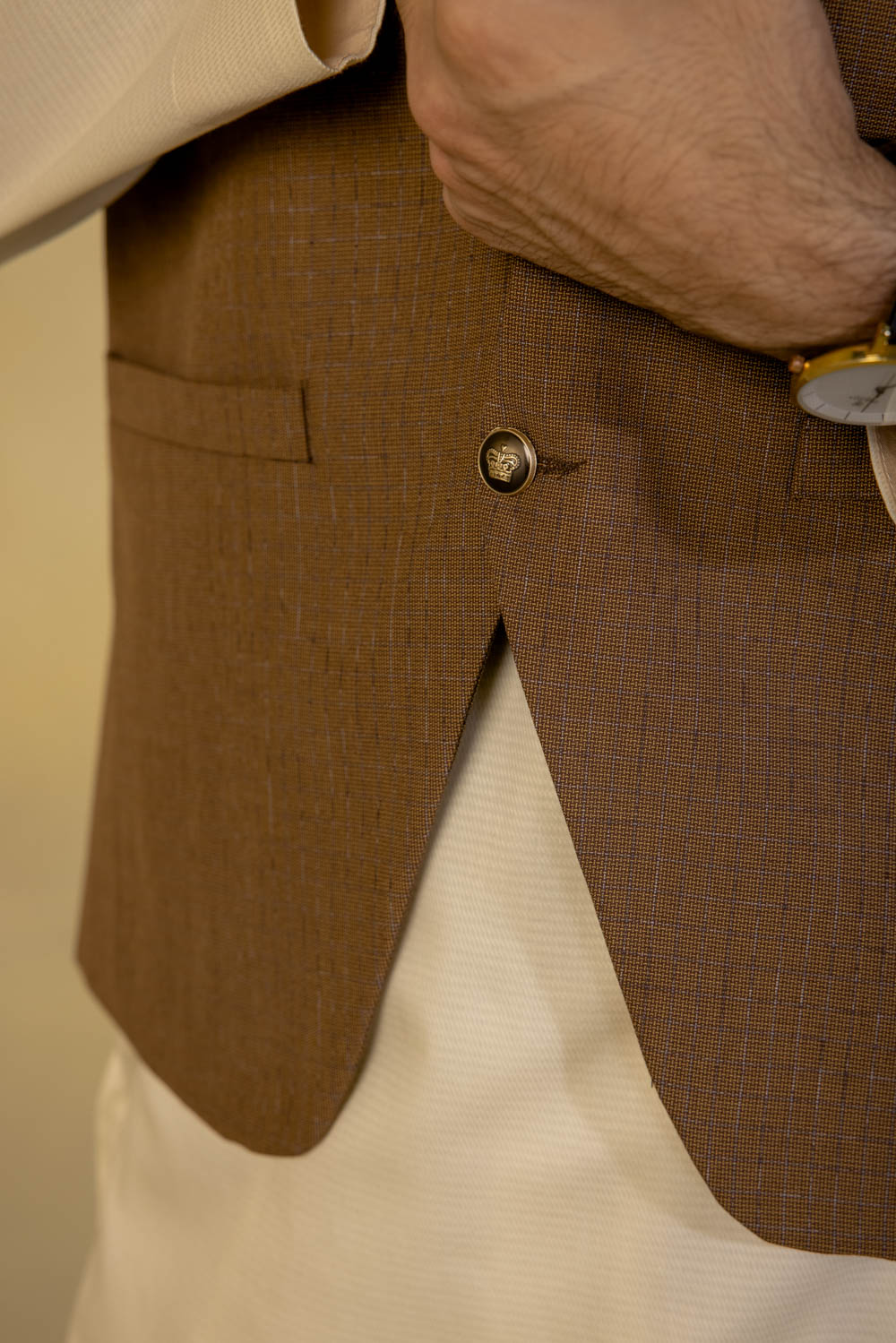 Embody grace in this tropical waistcoat in rust base, with detailing on band.