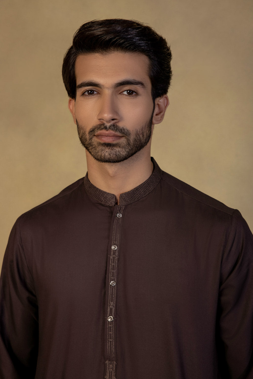 Look dapper in chocolate hues of this embroidered dobby suit with embroidery on band.