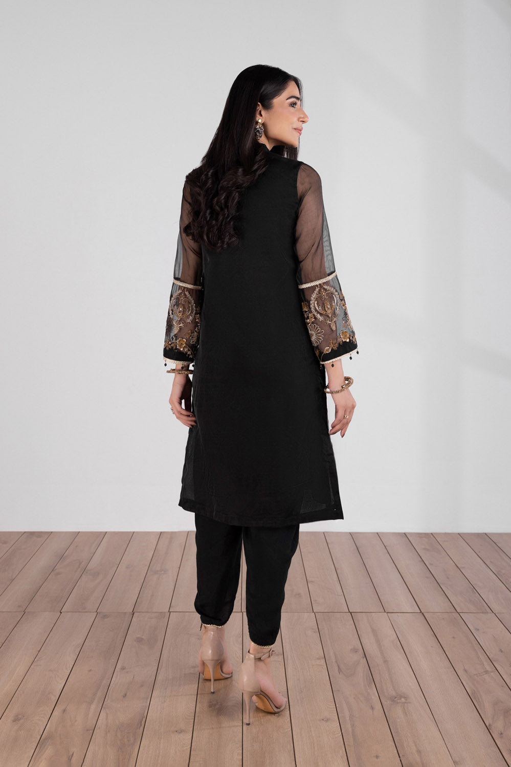 Style yourself this Eid in this blended organza A-line semi formal shirt imbued in a black base with embroidery imbued in gold at front and sleeves.