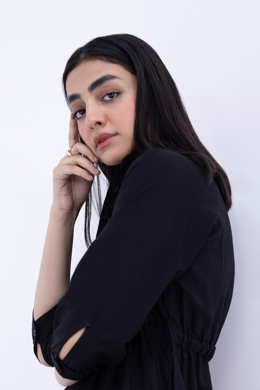 Black tier belted dress with collar and front placket till waist. Raglan sleeves with buttoned cuff details. Elasticated waistline.
