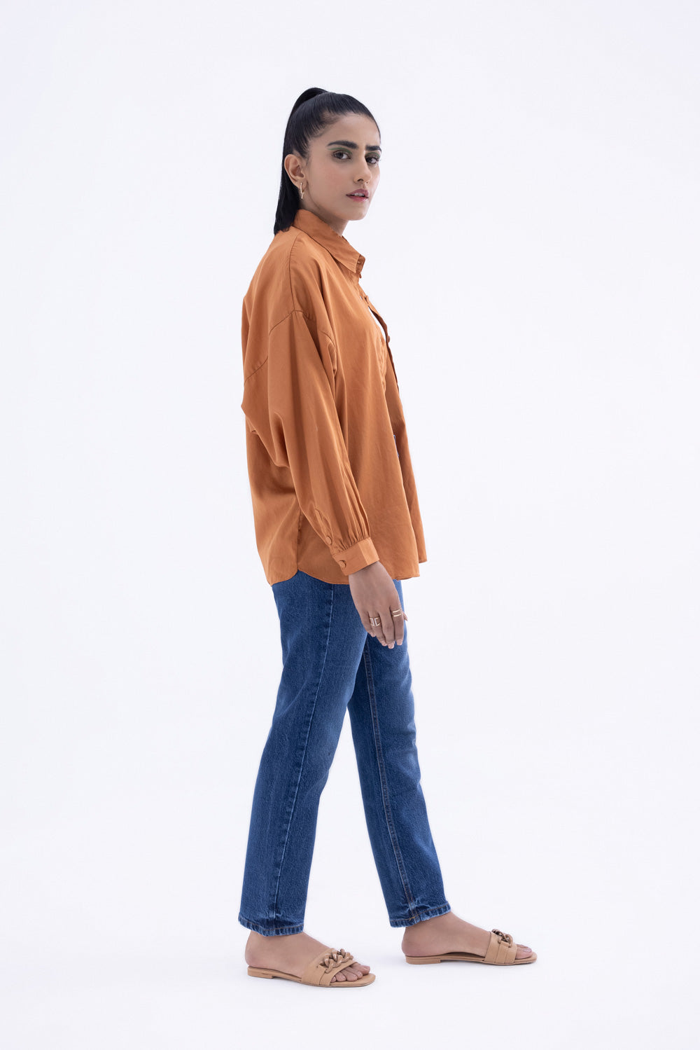 Solid loose fit button through shirt. Front patch pocket. Drop shoulders and voluminous sleeves with buttoned cuff details with fabric buttons