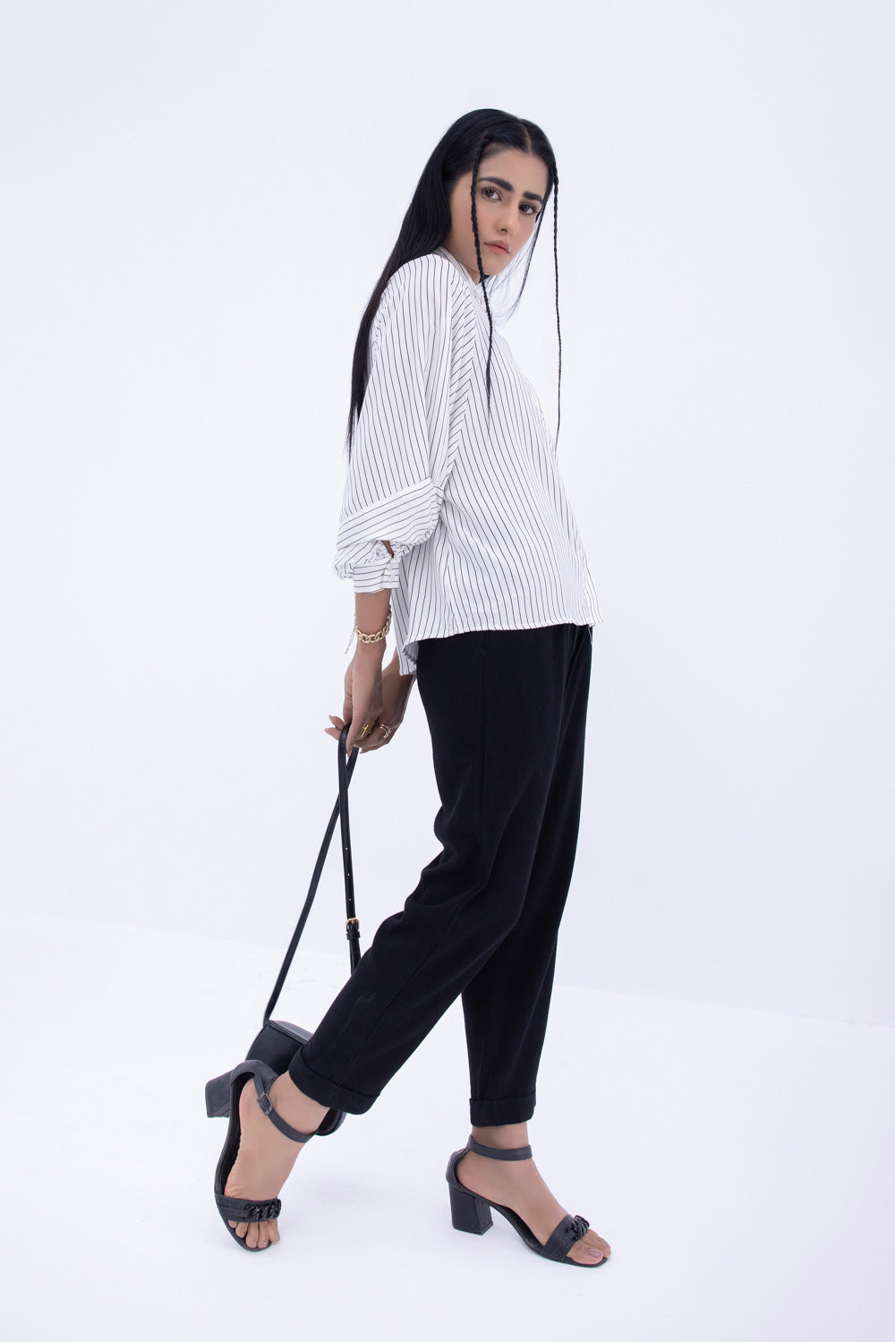 Striped drapey button through shirt with band collar. Raglan voluminous sleeves with cutline and cuff details