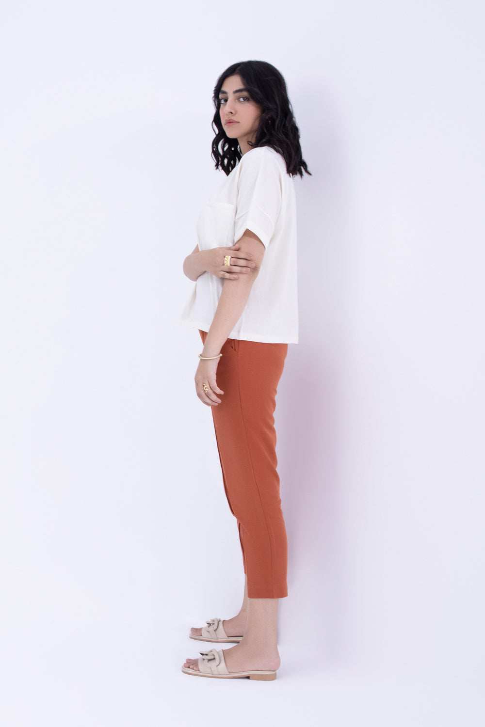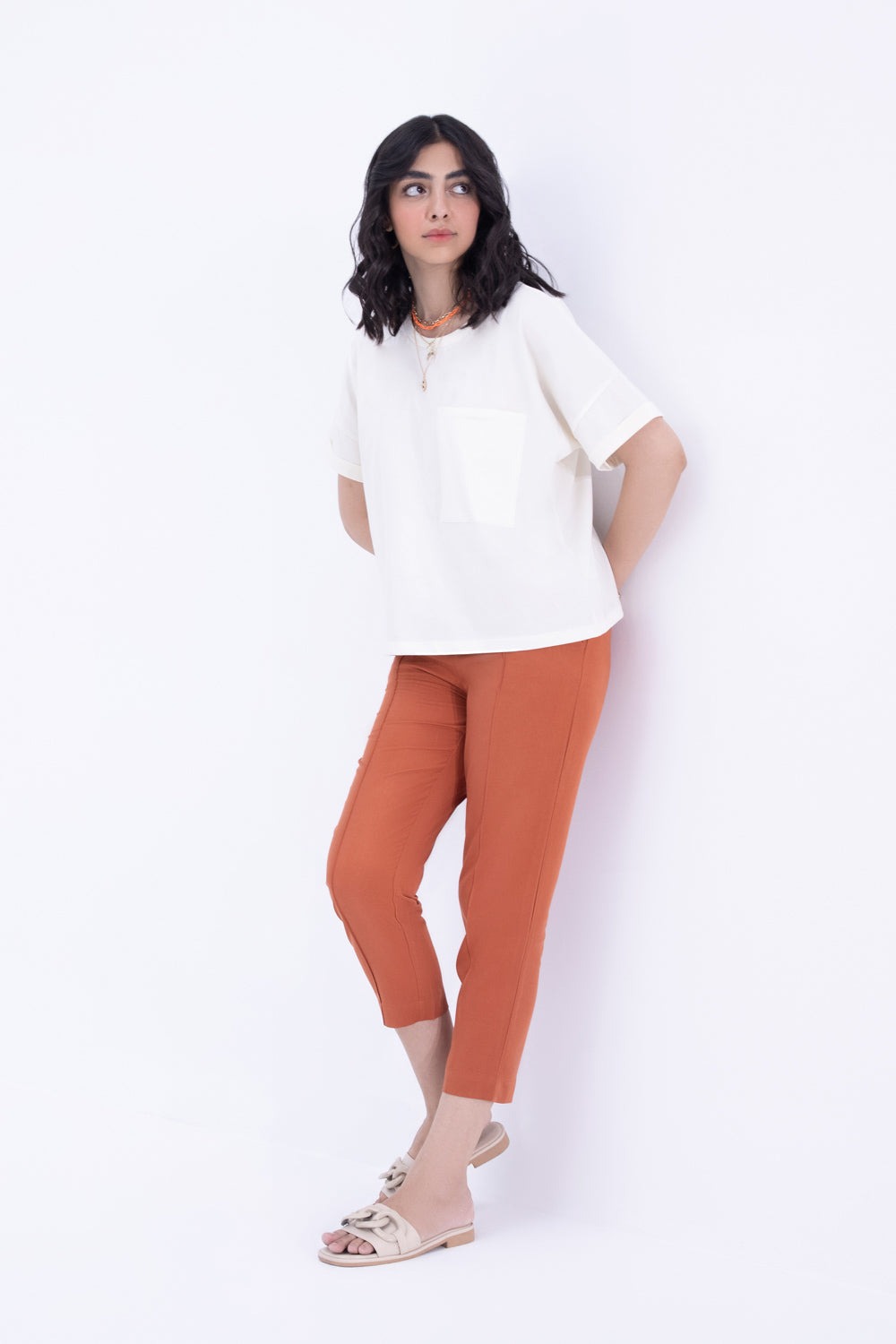 Oversized cream drop shoulder T-Shirt with round neckline and front pocket detail. Short sleeves with turned up hem.