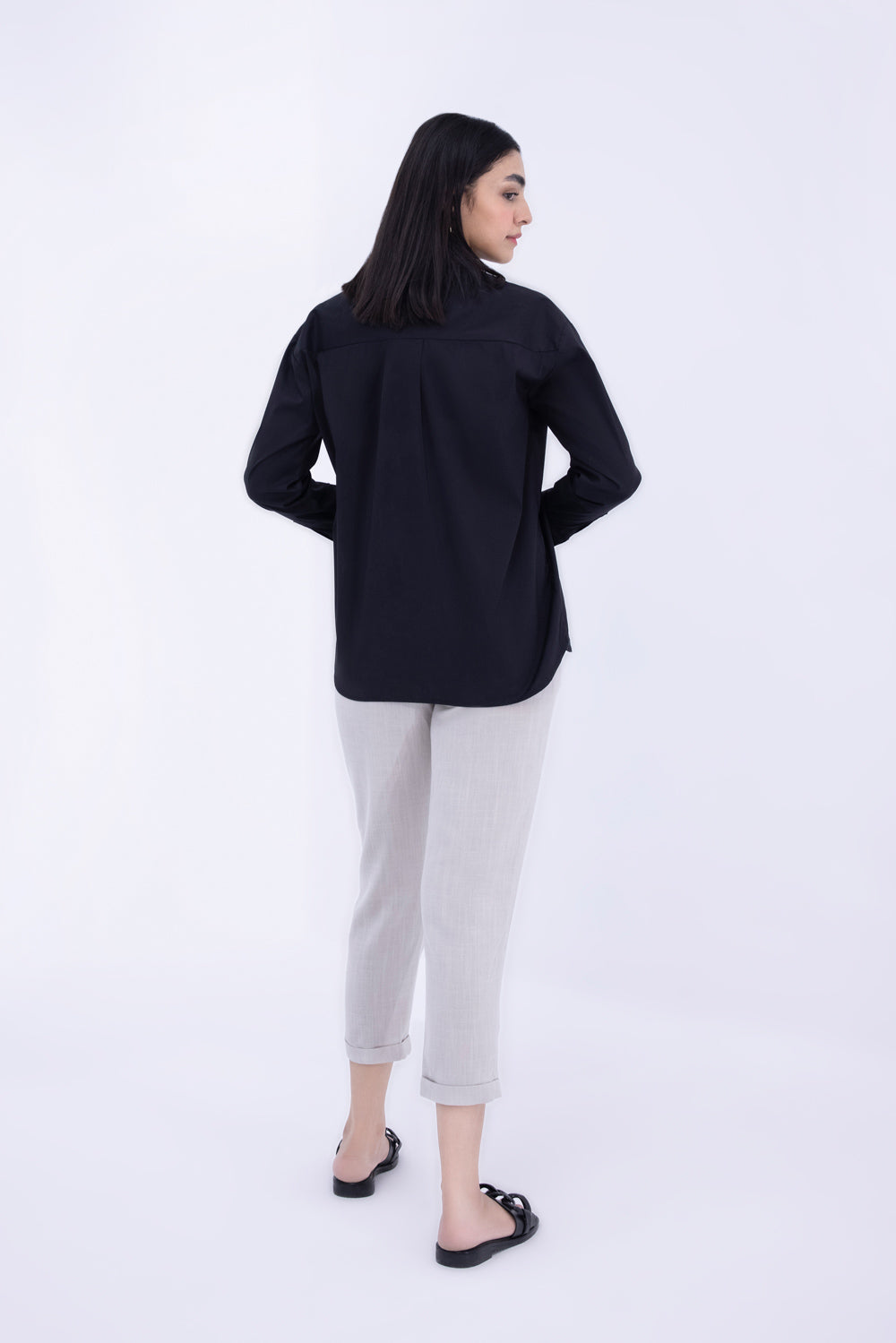Black button through shirt with collar and front tuck pleat details. Long sleeves with buttoned cuffs.