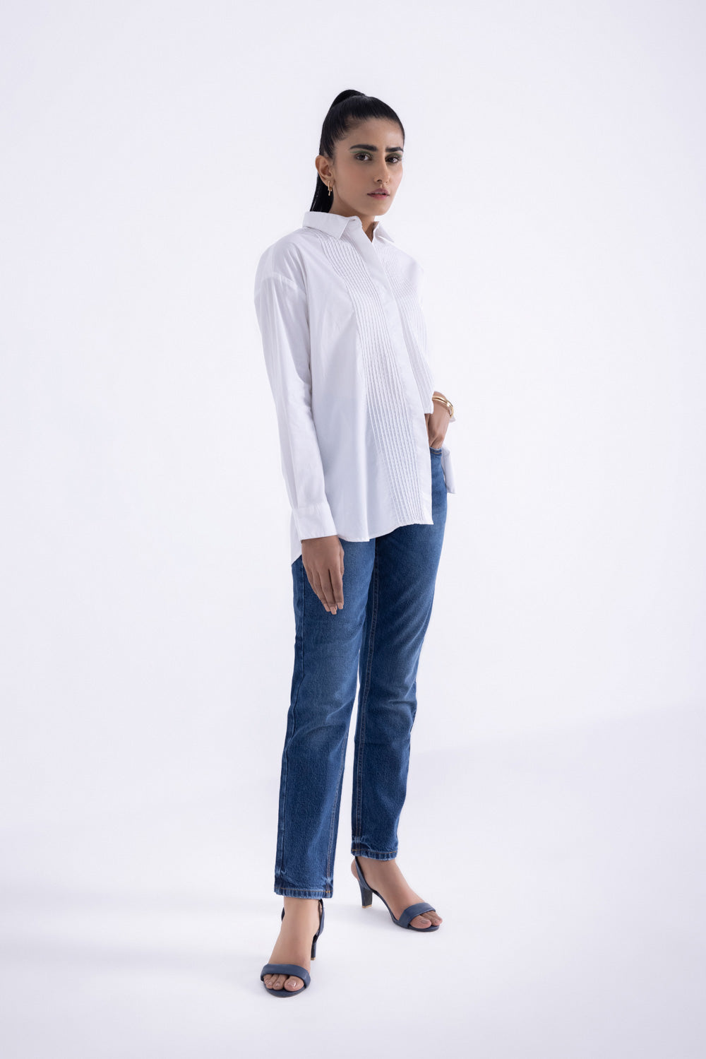 White button through shirt with collar and front tuck pleat details. Long sleeves with buttoned cuffs.