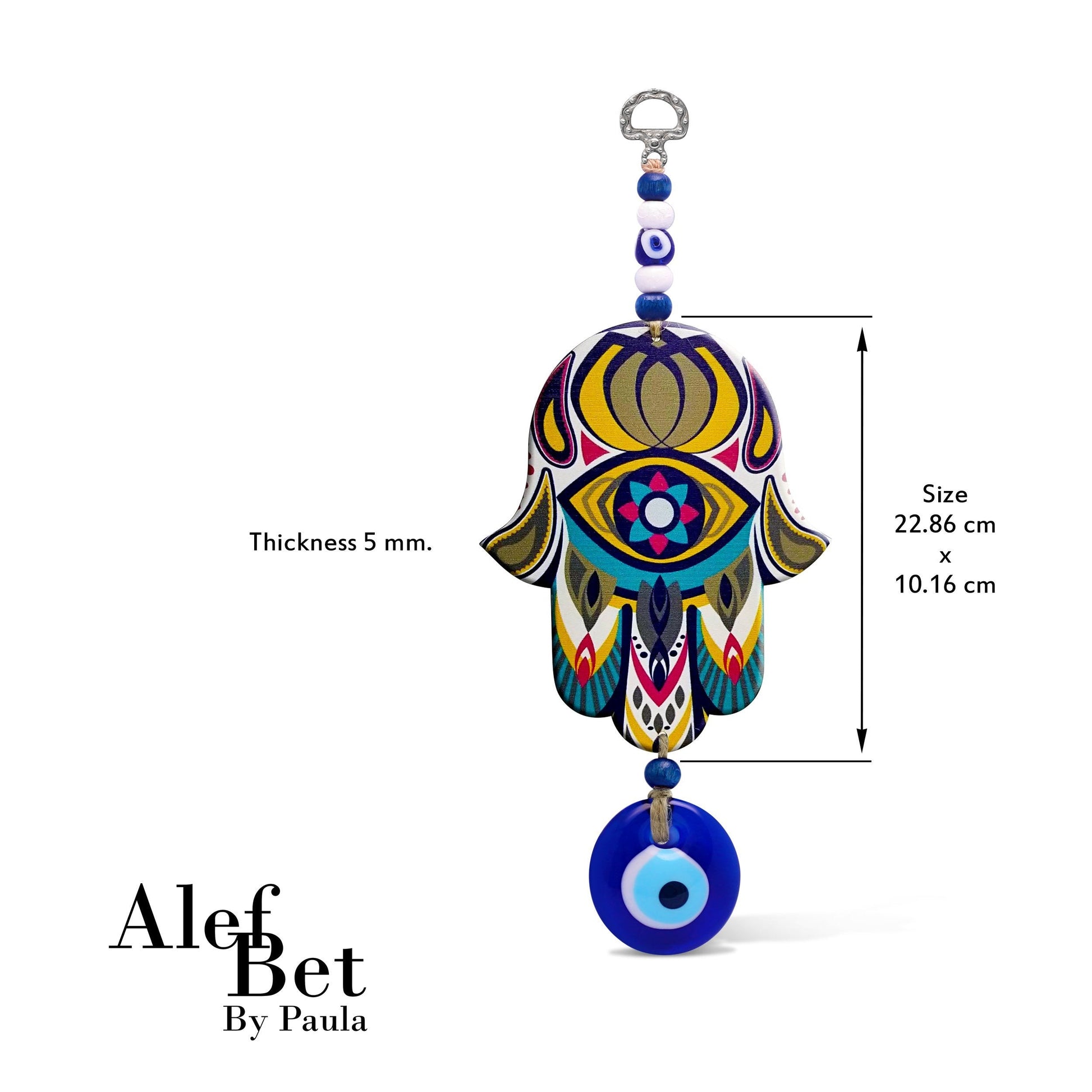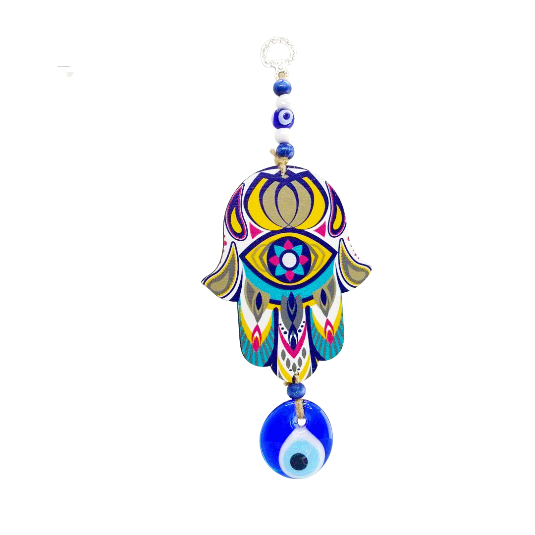 رنگین چمسا میں خوش قسمت نیلے رنگ کے شیشے کی بری آنکھ انگلی سے گھس رہی ہے ، تاکہ آپ اور آپ کے گھر میں رہنے والے سب کی حفاظت کریں اور ان کی حفاظت کریں۔ ہمسا لکڑی سے بنی ہے۔