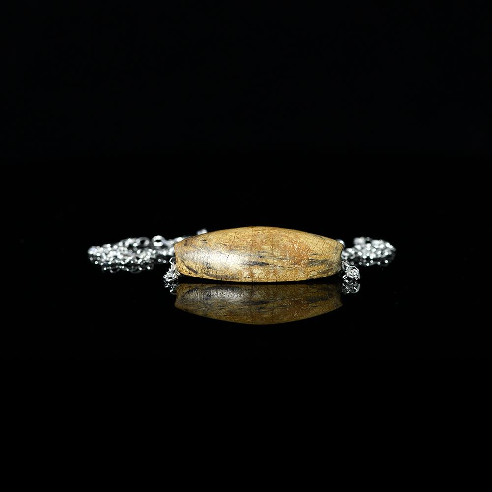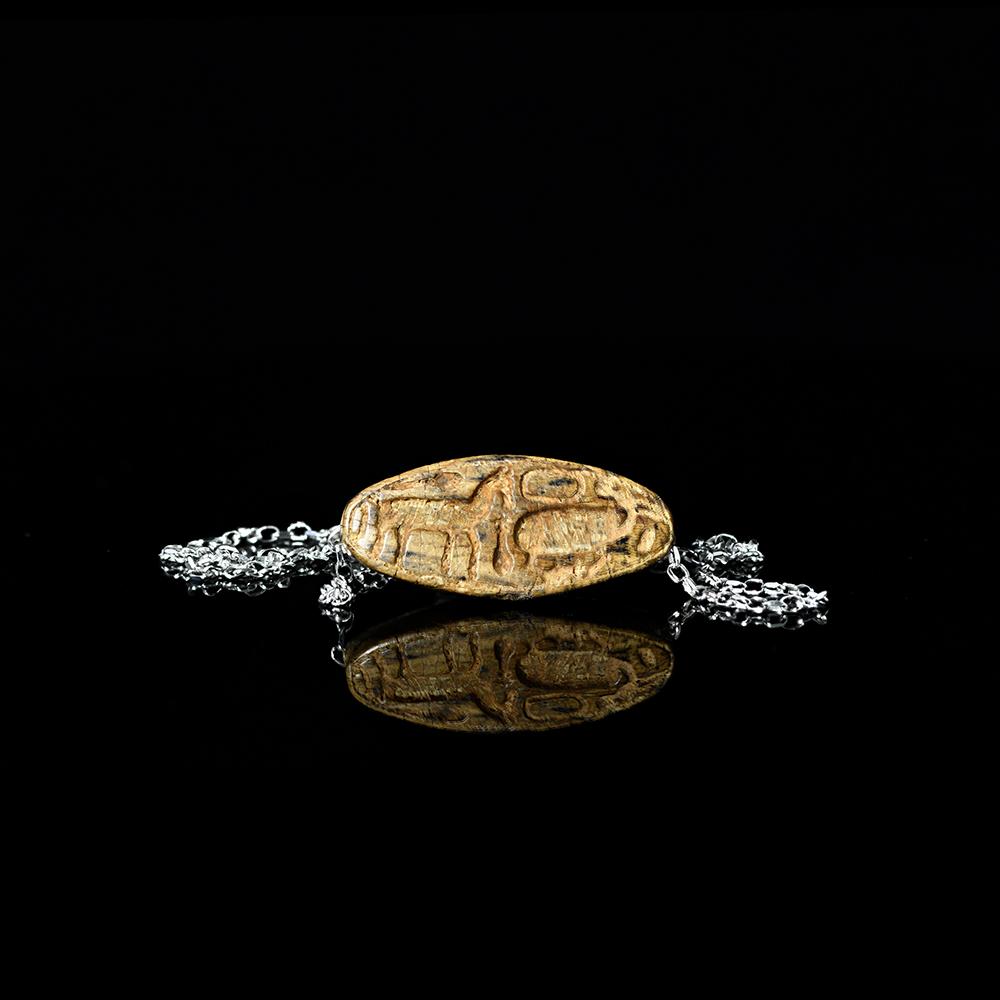 ایک لکھا ہوا اڈہ ، بائیں طرف ایک گھوڑا کے ساتھ لمبا شکل۔ معطلی کے لئے طول البلد چھید کر ایک لاکٹ کے طور پر سیٹ کیا گیا۔
