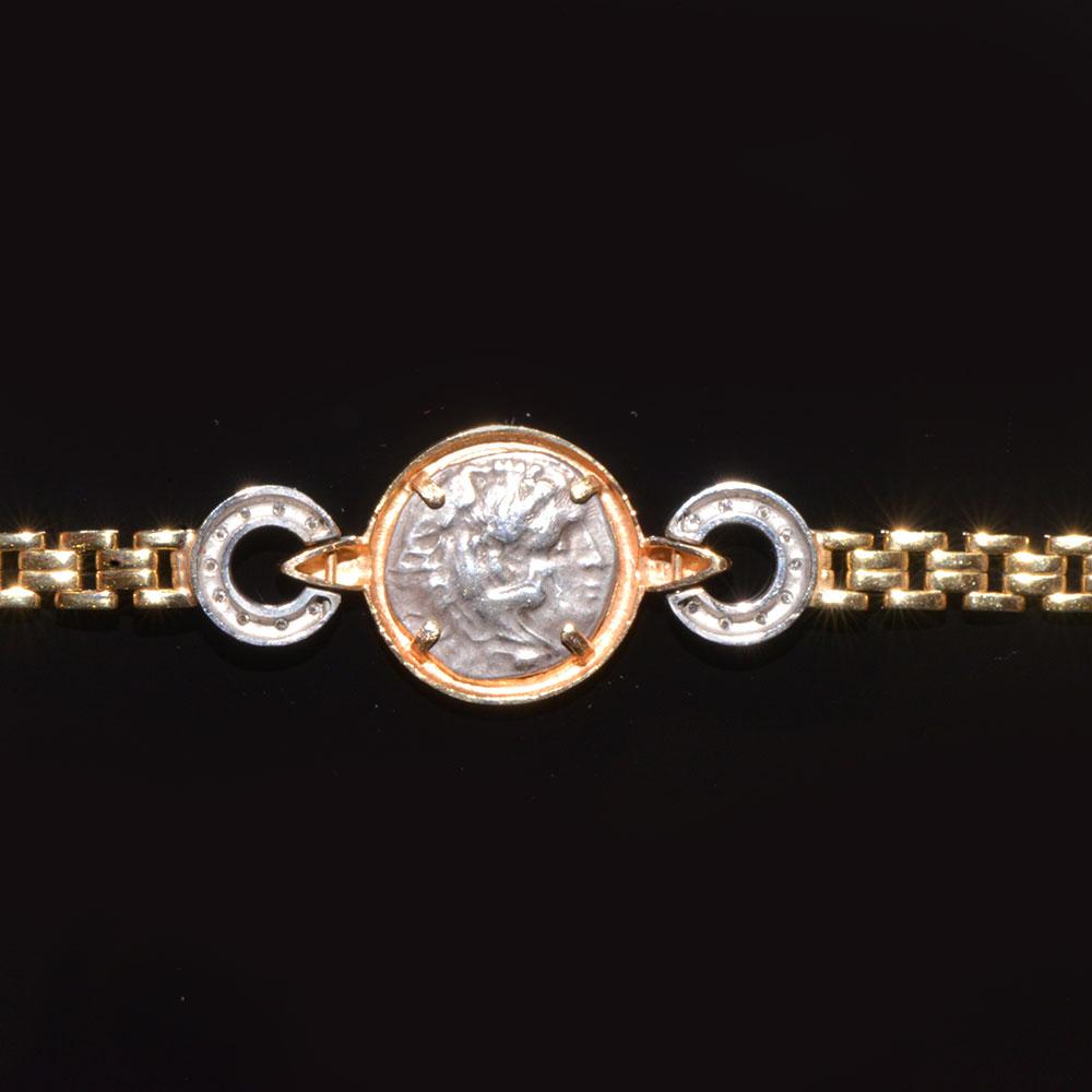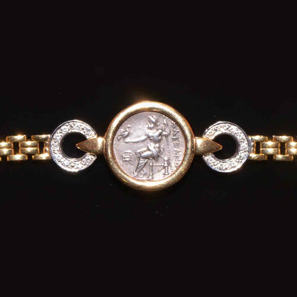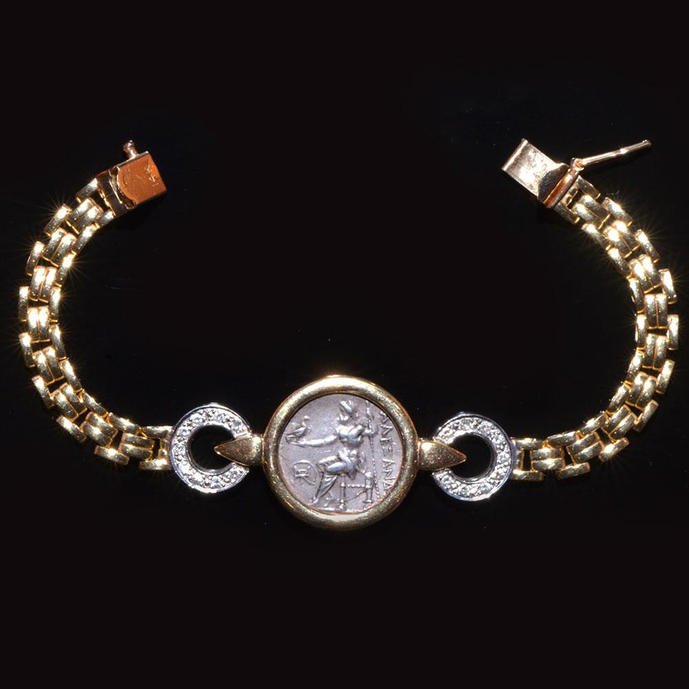 دو ہیرے کے حلقوں کے مابین ایک الیگزینڈر دی گریٹ ڈریکم سکے کے ساتھ ایک ناکام 14 قیراط سونے کا کڑا ، اس کے برعکس الٹا کا سامنا کرنا پڑتا ہے جس میں ایک تخت پر بیٹھے ہوئے الہی زیوس کو دکھایا گیا تھا ، ایک ٹانگ دوسرے کے پیچھے عبور کرتی ہے ، ایک عقاب اس کے دائیں ہاتھ میں تھا ، اس کے بائیں طرف ایک لمبا راج ، اور نیچے ایک مشعل ، اناپوئیپائے (سکندر کا) دائیں طرف ، بائیں طرف ایک مونوگرام H ہرکلز (رومن ہرکیولس) کی تصویر کو دائیں طرف کی تصویر دکھاتا ہے ، جس میں مشہور شیر کی جلد کا ہیڈ ڈریس پہنا ہوا تھا۔