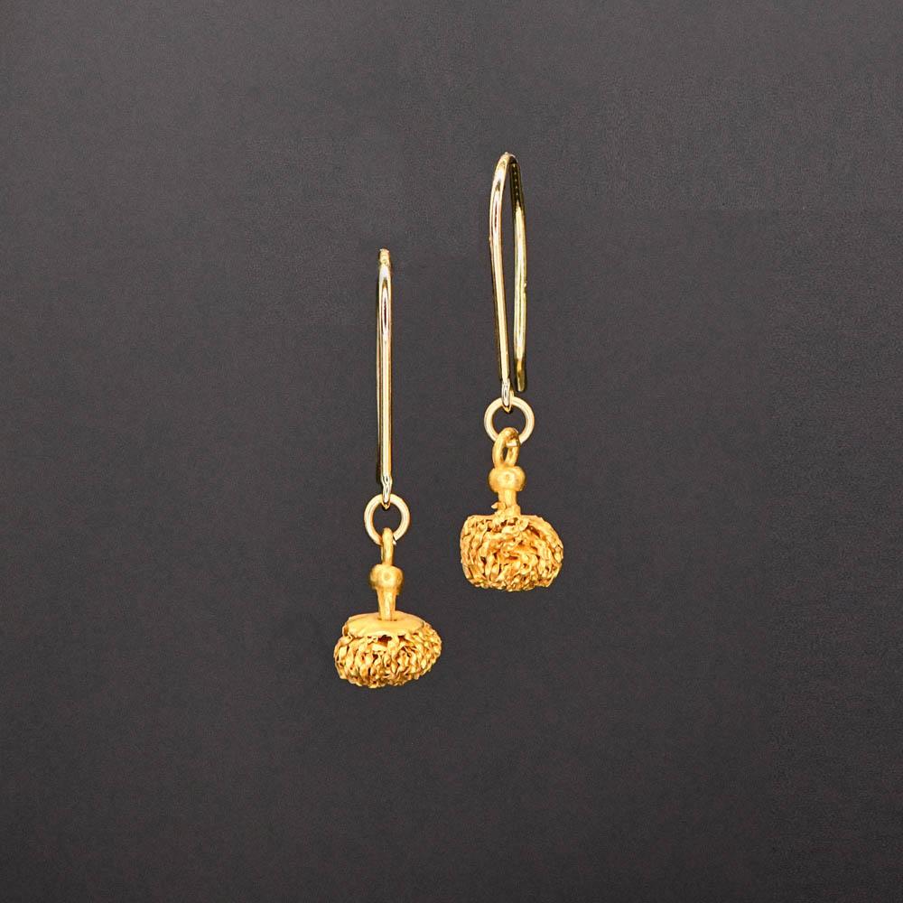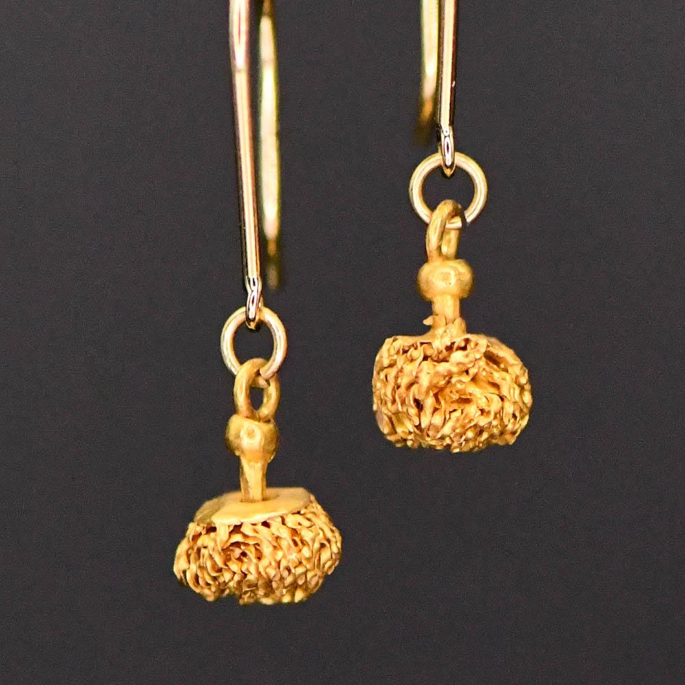 ان خوبصورت سونے کی بالیاں قدیم یونانی قطرے نمایاں ہیں جو اعلی کراٹ سونے کے ٹھیک بٹی ہوئی تار سے تشکیل پاتی ہیں ، چالاکی سے اس کروی شکل کو تیار کرنے کے لئے کام کرتے ہیں۔ یہ قدیم گیندیں جدید 18K سونے کے کان کی تاروں پر لگائی گئیں ہیں۔