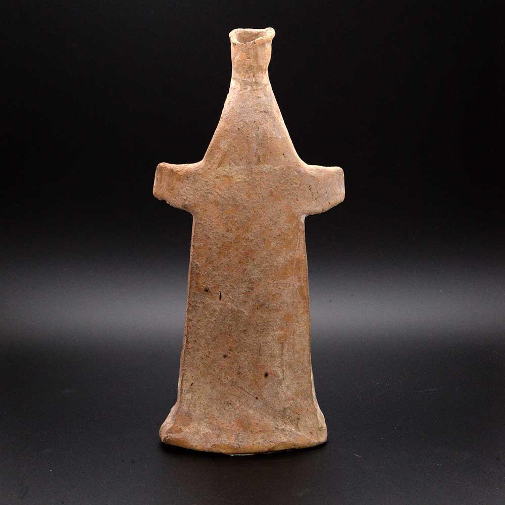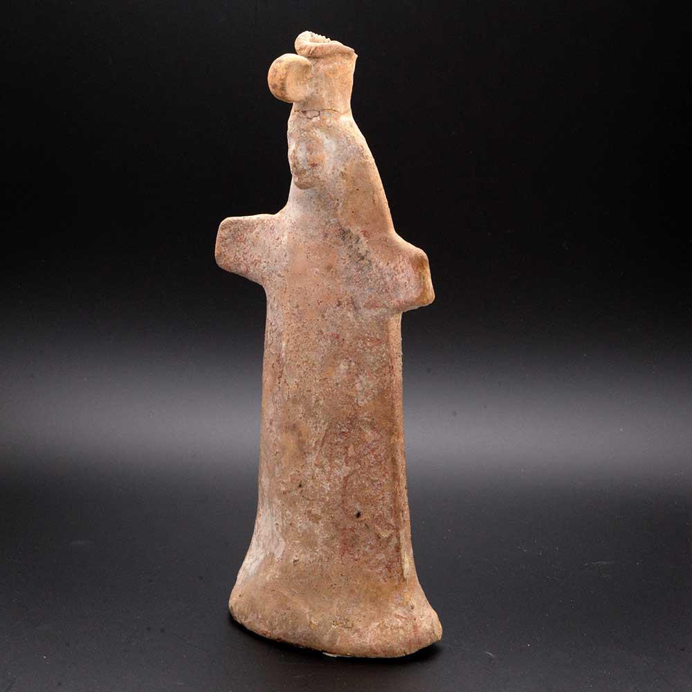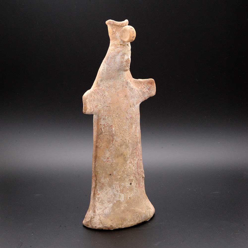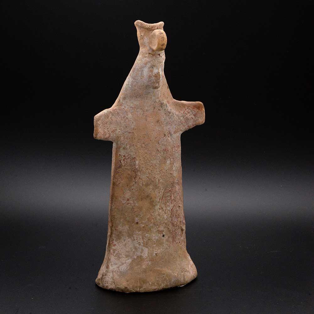 ایک دیوی کا ایک ہاتھ سے تیار ٹیراکوٹا "پیپیڈس" مجسمہ ، چپٹا ہوا شکل کا بازوؤں کے ساتھ کھڑا ہے اور ایک لمبا کڑھائی والا لباس اور اعلی پولس پہنے ہوئے ہے جس میں مرکزی سرکلر زیور کے ساتھ اس کی دیوی کی حیثیت سے اس کی حیثیت کا اشارہ ہے۔