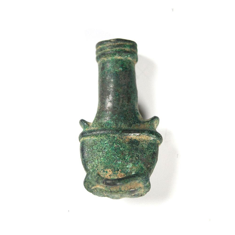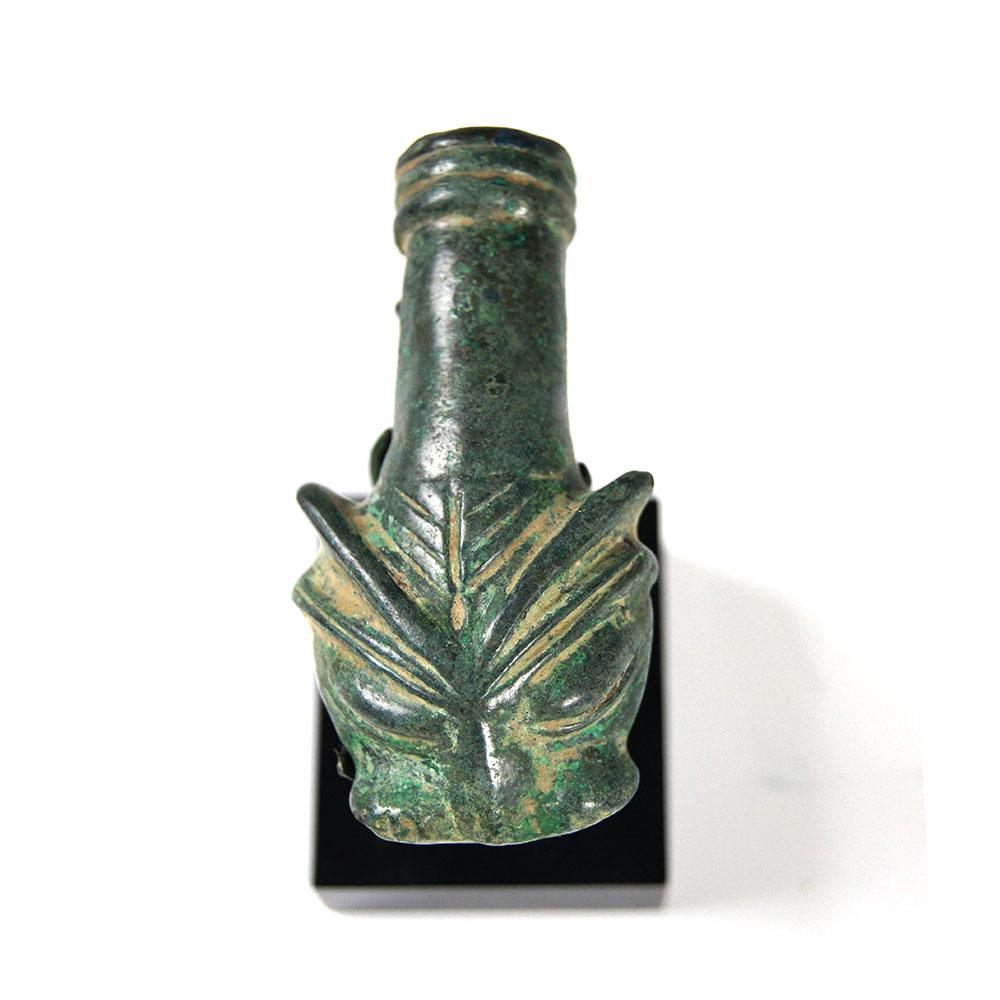 کھوکھلی کانسی کا سلنڈر ایک اسٹائلائزڈ فلائن چہرے پر ختم ہوتا ہے۔ ٹکڑے کے نچلے حصے میں معطلی یا منسلکہ کے لئے لوپ۔