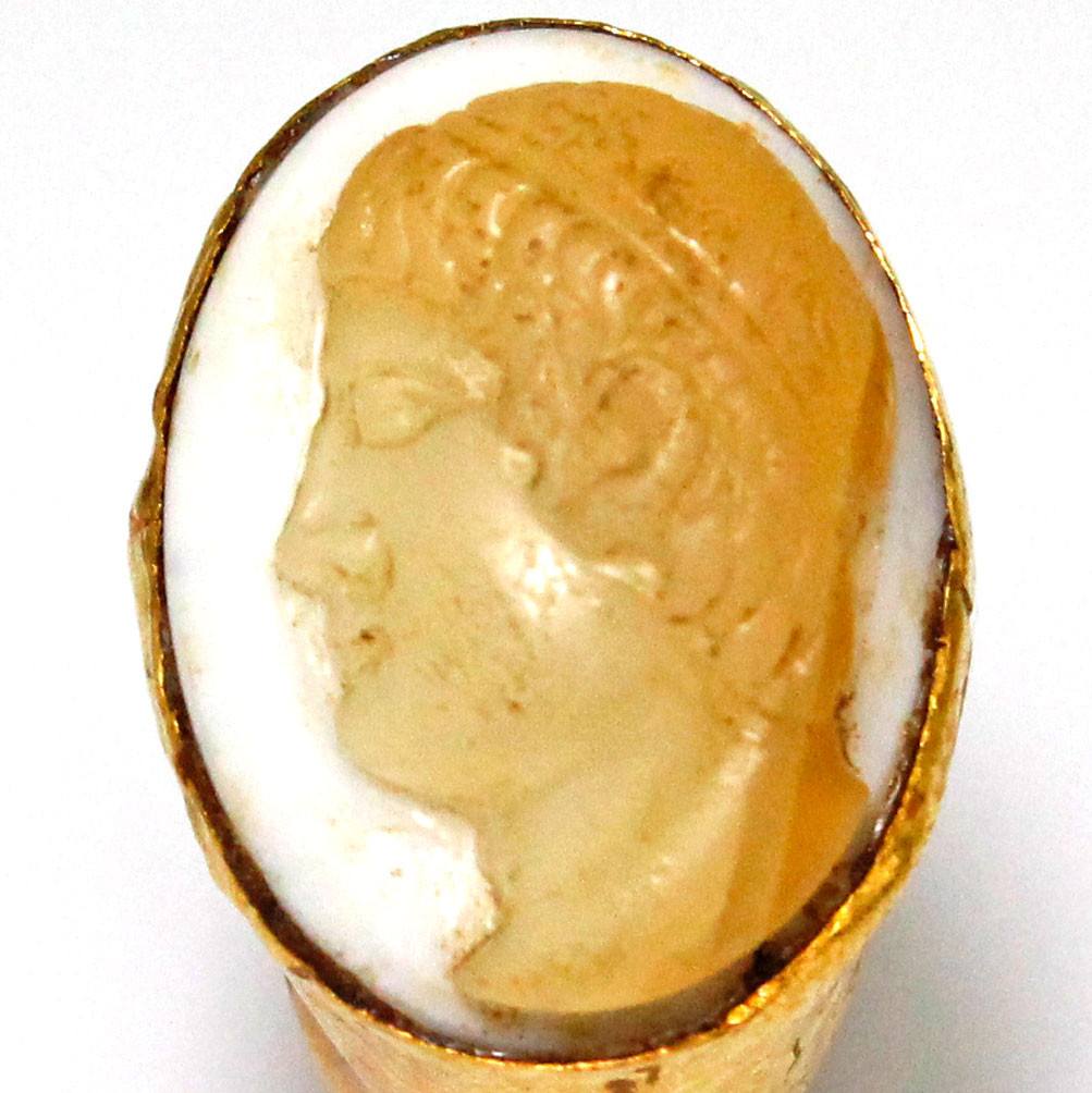 انڈاکار کے منی نے دو پرتوں پر اپولو کے پروفائل بسٹ کے ساتھ کھدی ہوئی ، بائیں طرف ، بائیں طرف ، بادام کی شکل کی آنکھیں ، ایک نمایاں ناک اور تھوڑا سا تیز منہ ، اس کے گھنے گھوبگھرالی بالوں کو ایک ڈیام سے آراستہ کیا گیا ہے۔ اس پتھر میں دو قدرتی رنگ شامل ہیں ، چہرے کی تشکیل کے لئے کھدی ہوئی اوپری سطح ایک کریمی پیلا پیلا ہے ، جبکہ نچلے درجے کے پس منظر کو مہارت کے ساتھ سفید میں پیش کیا گیا ہے ، جس سے ایک خوبصورت برعکس پیدا ہوتا ہے۔ اونچی بیزل کے ساتھ ایک اعلی کراٹ سونے کی انگوٹھی میں سیٹ کریں۔