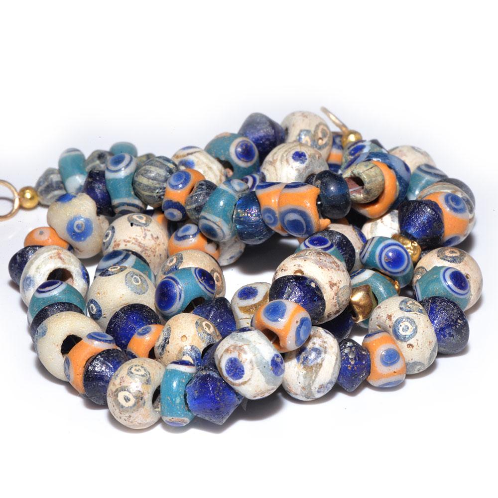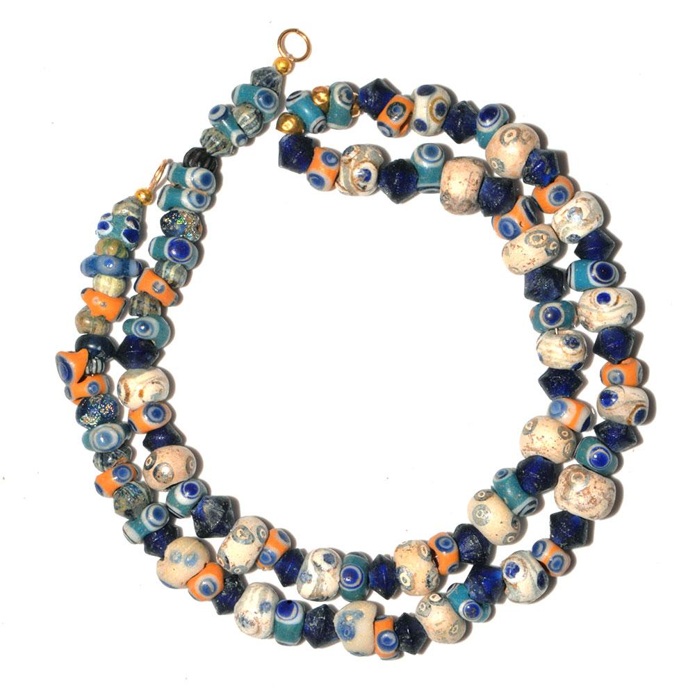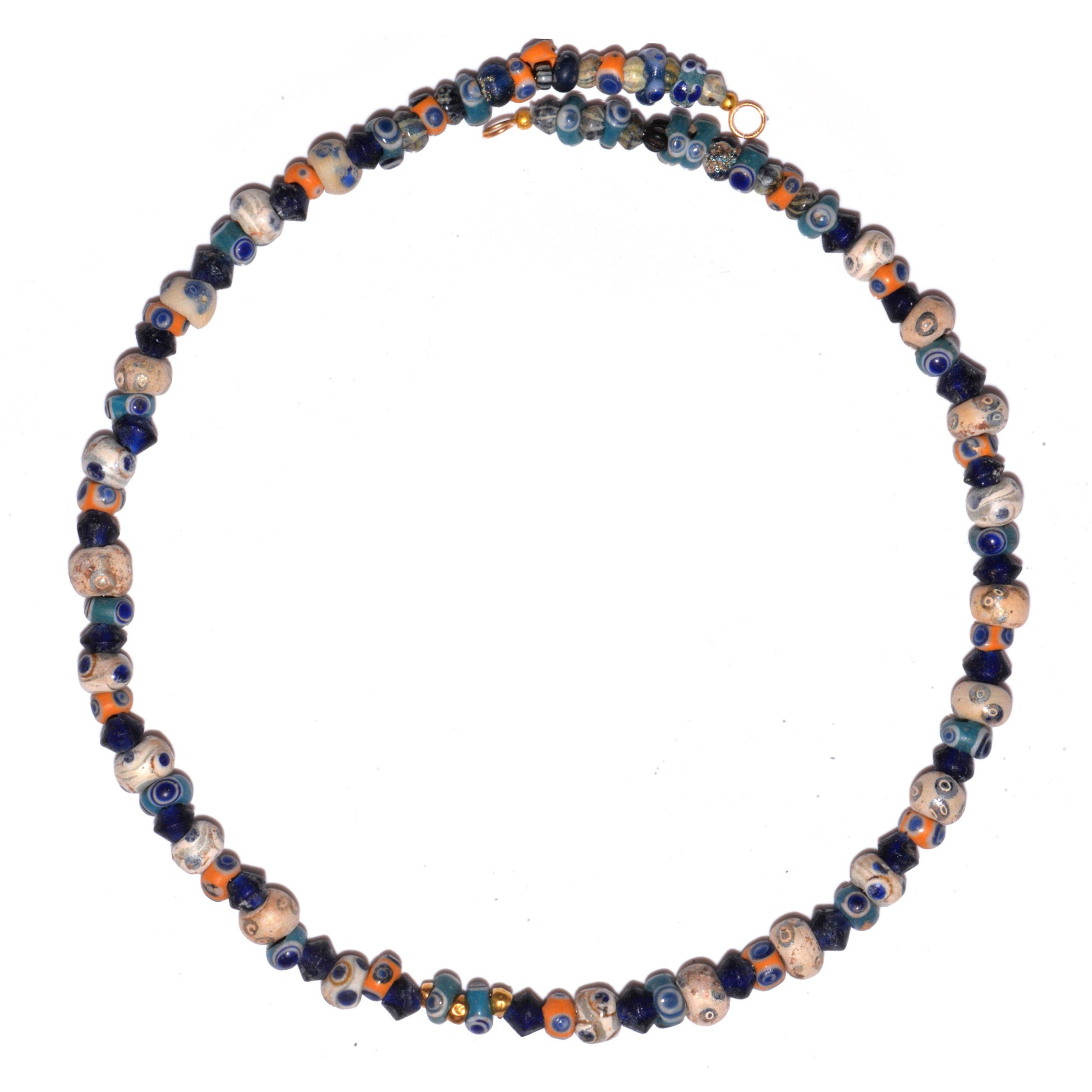 اس شاندار ہار میں پیلے اور نیلے ، فیروزی اور نیلے رنگ کے ساٹھ شیشے کی آنکھوں کی مالا شامل ہے ، اور سفید اور نیلے رنگ ، جس میں پارباسی روشنی اور گہرے نیلے رنگ کے شیشے کے موتیوں کی مالا ہے۔ ہار کے بیچ میں تین قدیم سونے کے مالا۔