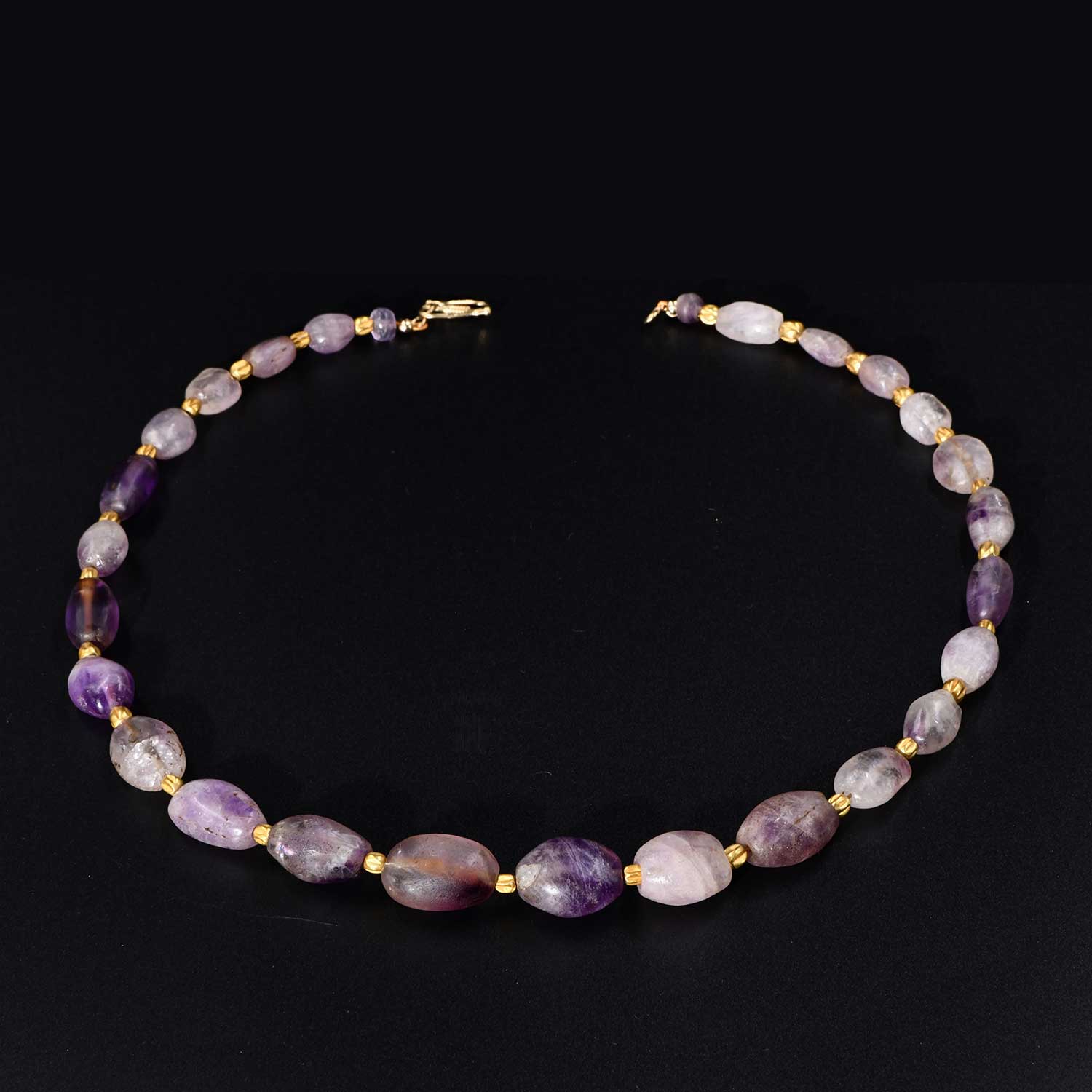 کاریگر کی مہارت ان خوبصورتی سے تشکیل دیئے گئے امیٹیسٹ موتیوں سے ظاہر ہوتی ہے۔ گہری امیر ارغوانی رنگ سے ایک نرم لیوینڈر رنگ تک رنگین ، وہ سونے کے اسپیسر موتیوں کے ساتھ خوبصورتی سے اس کے برعکس ہیں جو 19 ویں صدی کے "گرینڈ ٹور" دور کے زمانے کے قریب ہیں جب اس طرح کی اچھی طرح سے تیار کردہ مثالوں کی بڑی مانگ تھی۔ ایک ساتھ ، وہ کسی بھی خوبصورتی کے ل a ایک ہار فٹ تیار کرتے ہیں۔
