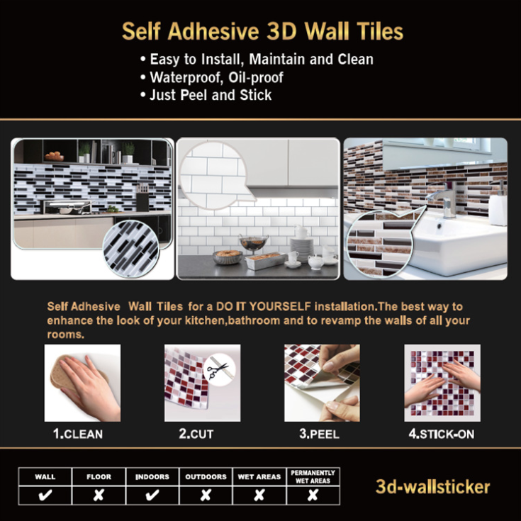 تھری ڈی موزیک ٹائل خود چپکنے والی اسٹیکرز کا چمکدار شیشے کے ٹائل کا 3D اثر اور احساس ہے۔ اس کا اطلاق مڑے ہوئے سطح اور زاویہ سطح پر کیا جاسکتا ہے۔ اور آپ اسے اپنی ترجیحی شکل کے لئے کینچی یا کٹر کے ساتھ کاٹ سکتے ہیں تاکہ آپ اسے نہ صرف دیوار کا استعمال کرسکیں۔