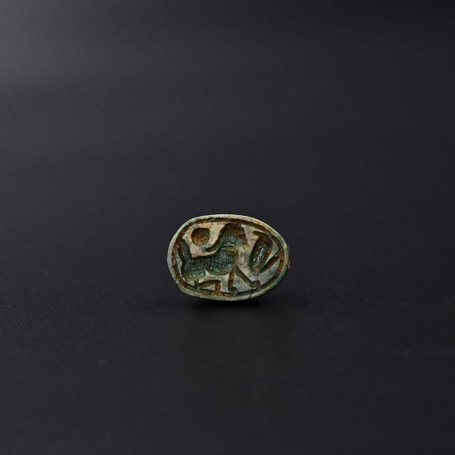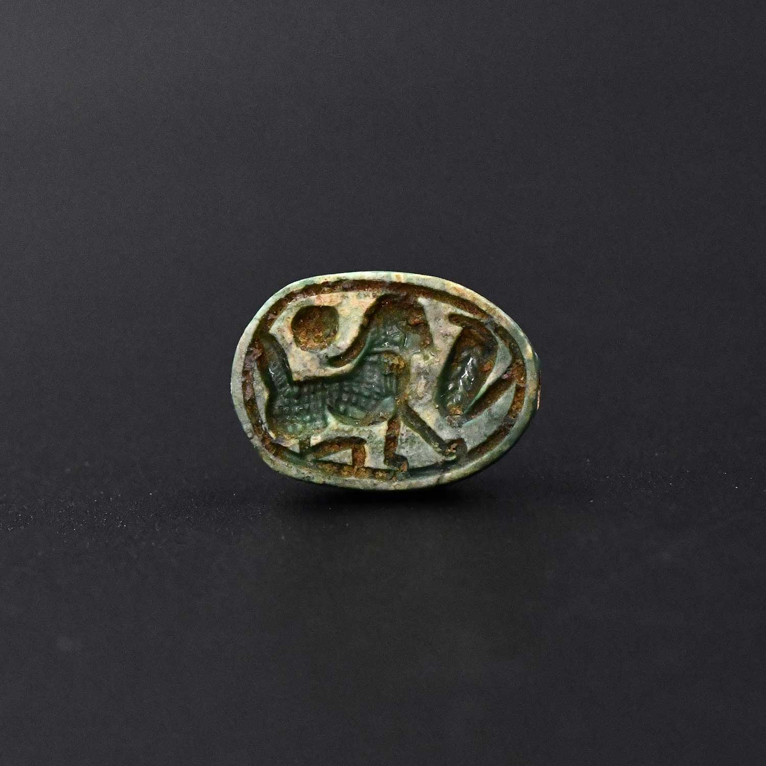 اس سکاراب کے نیچے ، ایک بھڑک اٹھے ہوئے ڈیزائن میں شاہی ہیڈ ڈریس پہنے ہوئے ایک تیز شیر کو دکھایا گیا ہے ، جو ایک شاہی سورج کی ڈسک کے ساتھ آمنے سامنے ہے ، جو شاہی سورج کی ڈسک ہے ، جو بادشاہ اور اس کی مافوق الفطرت طاقت کی علامت ہے۔ یہ شے شاید بادشاہ اور مقدس چقندر دونوں کی طاقت اور تحفظ کی درخواست کے لئے جادوئی تعویذ کے طور پر کام کرتا تھا۔