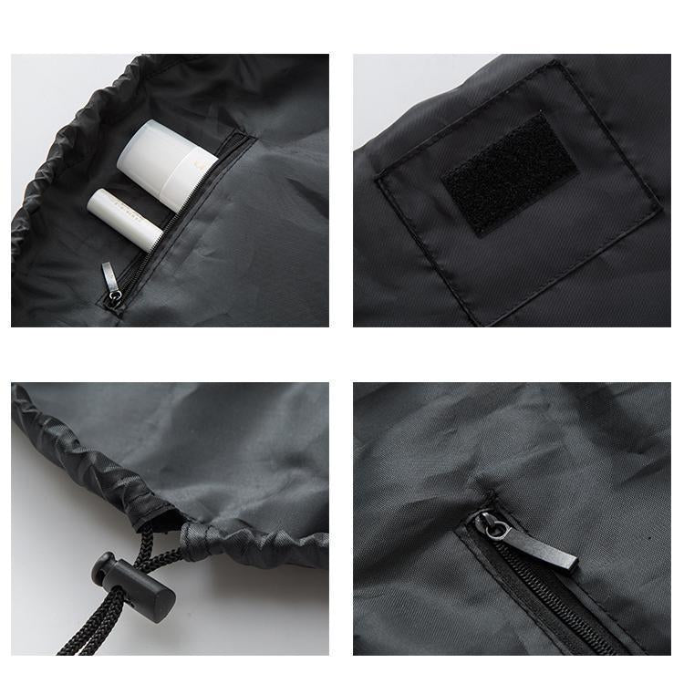 • ایک ویلکروڈ فرنٹ اسٹوریج جیب جب بند اور لے جانے یا تھیلے کو لے جانے یا اسٹور کرنے پر ڈراسٹرینگ کو روکنے کے لئے ایک جگہ مہیا کرتی ہے۔