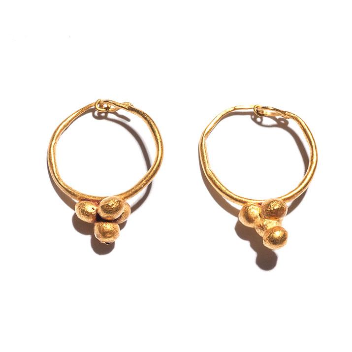 سونے کے ہوپ کی بالیاں کی اس خوبصورت جوڑی میں انگور کے جھرمٹ کی شکل میں اڈے پر سونے کی گیند کی ایک دانے دار سجاوٹ ہے۔