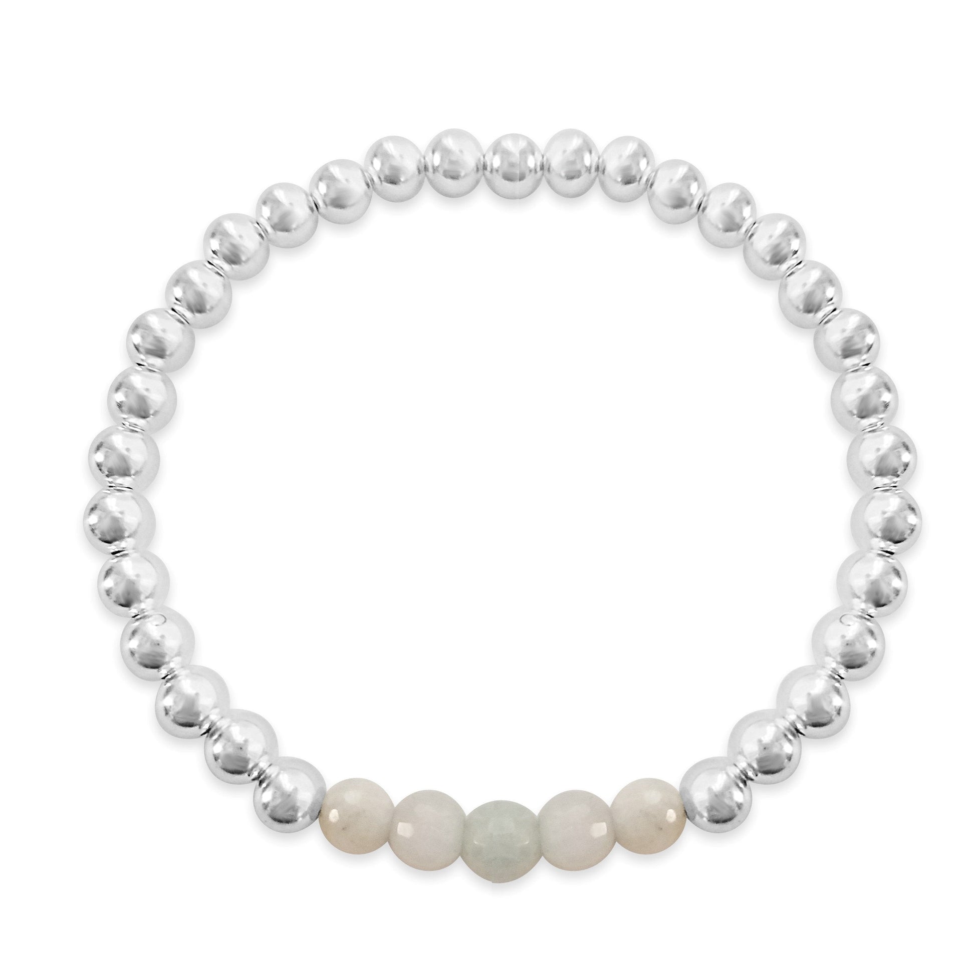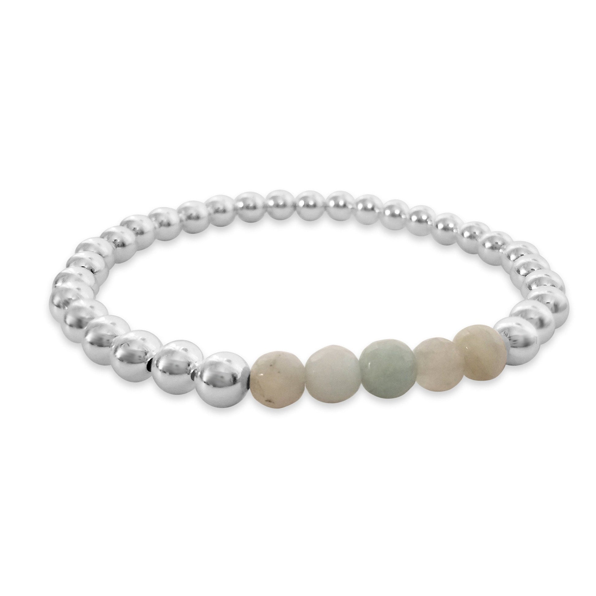 - ٹھنڈا اور پرسکون ایکوامارین جواہر اسٹون موتیوں کا کڑا جس کا سائز 5 ملی میٹر میں سٹرلنگ سلور موتیوں پر دکھایا گیا ہے۔