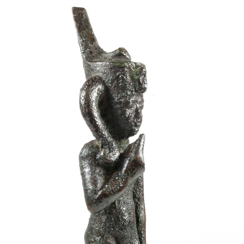 یہ کانسی کا مجسمہ خدا کے ہارپوکریٹس کی نمائندگی کرتا ہے ، یعنی بچے۔ یونانیوں نے مصری 'ہار پا-کھرڈ' سے ہارپکریٹس کا نام پیدا کیا ، لفظی طور پر 'ہورس دی کلڈ'۔ انہوں نے خطرناک مخلوق کو روکنے کے لئے ایک تعمیری قوت کی حیثیت سے کام کیا اور فینیشینوں کے ساتھ ایک مقبول دیوتا تھا جو جغرافیہ اور تجارت دونوں کے ذریعہ مصر سے قریب سے جڑے ہوئے تھے۔ جیسا کہ اس مثال میں دکھایا گیا ہے ، اسے اکثر ننگے بچے کی حیثیت سے پیش کیا جاتا تھا ، اس کے منہ پر دائیں انڈیکس انگلی کے ساتھ ، اس کے دائیں کندھے پر نوجوانوں کے لٹکے ہوئے ایک لیٹڈ سیڈلوک کے ساتھ ہیڈ ڈریس پہنے ہوئے تھے ، جو ایک لازمی طور پر آگے بڑھتے ہیں۔ آئتاکار بنیاد