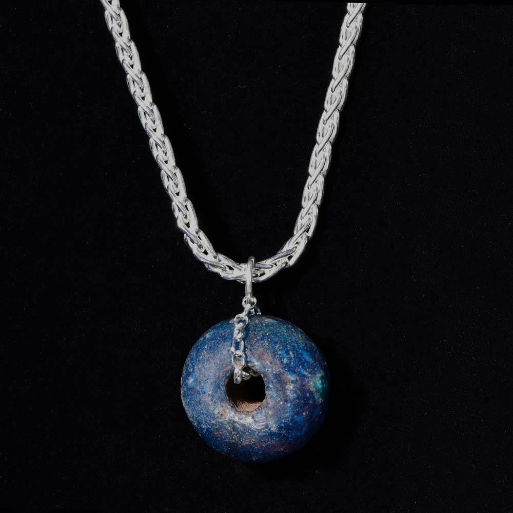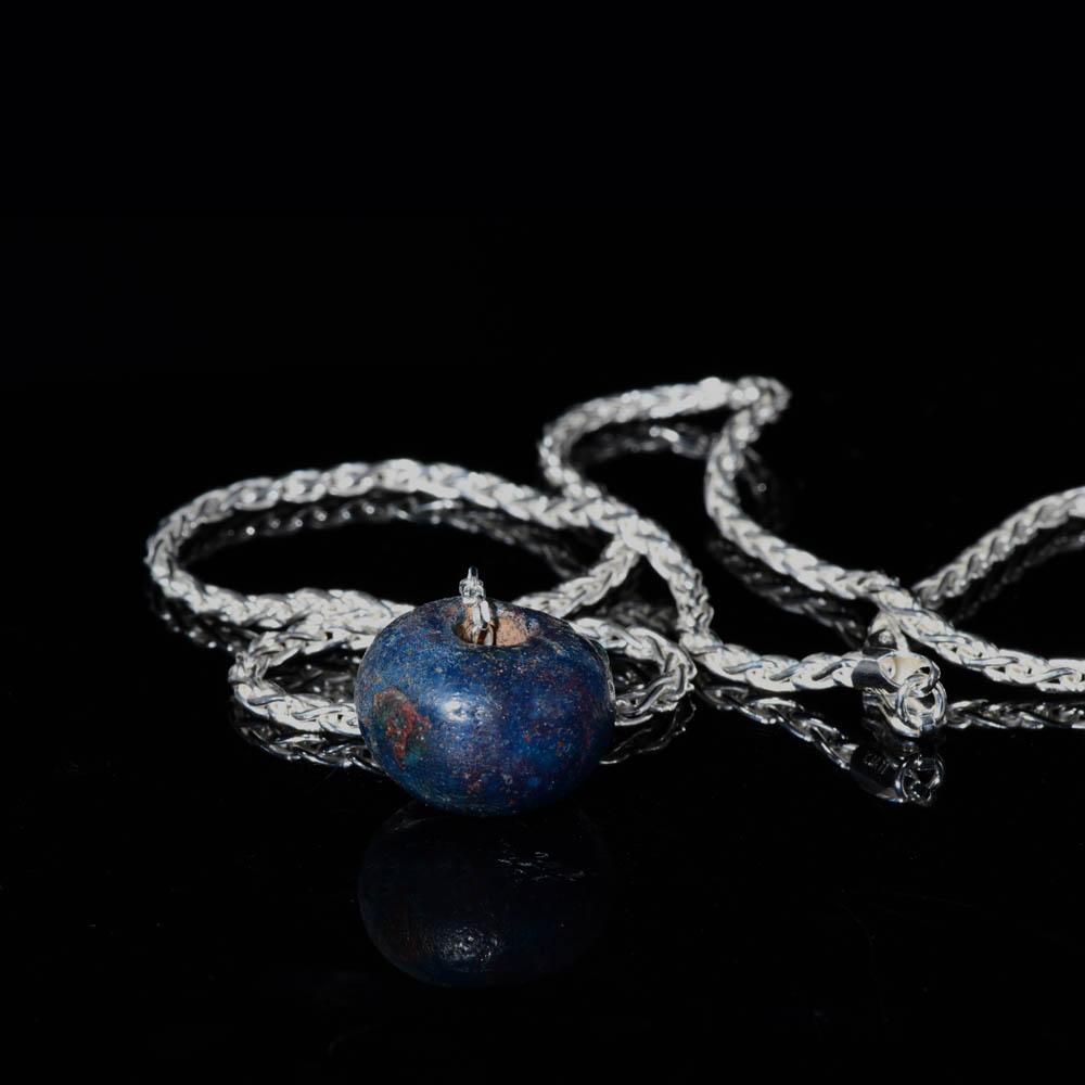 ایک خوبصورت نیلے رنگ کے گلیز اور مرکز کے ذریعے ایک بڑے معطلی کے سوراخ کے ساتھ گول شکل کا مالا ، 20 انچ چاندی کی ترنشی مزاحم زنجیر پر کھڑا ہے۔