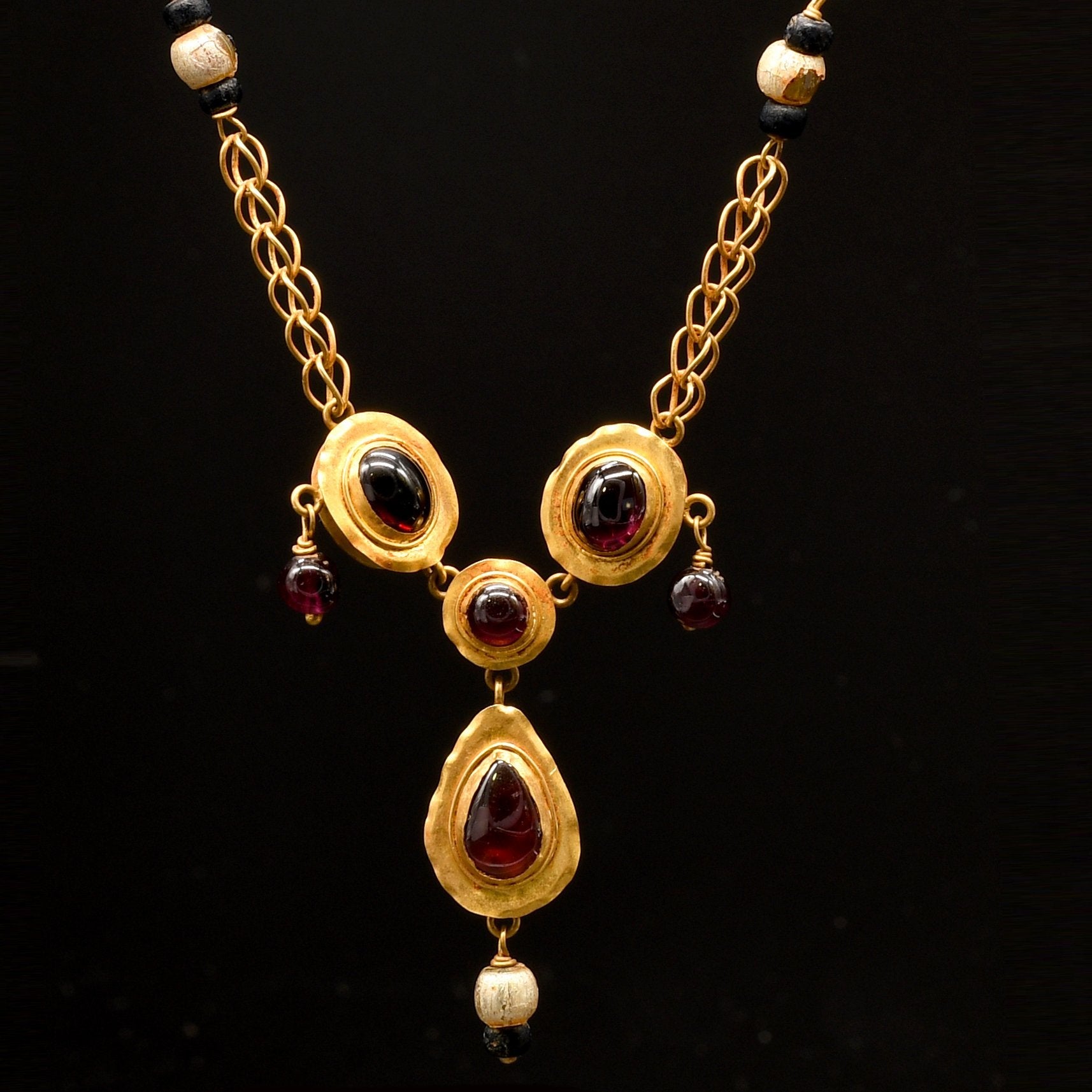 گارنیٹ ، موتی اور شیشے کے عناصر کے ساتھ سونے کا ایک خوبصورت ہار۔ سنٹرپیس جس میں تین گارنیٹس ہیں جن میں گول سونے کے بیزلز میں دو پھانسی والے گارنیٹ موتیوں کے ساتھ رکھا گیا ہے ، ایک چوتھا گارنیٹ جس میں سونے کے آنسو میں واقع ہے جس میں مرکز سے لٹکا ہوا ہے ، نیچے ایک موتی کے ساتھ ، چار گارنیٹ موتیوں کی مالا ، چار موتیوں کی مالا ، اور آٹھ بلیو کے ساتھ سجا ہوا زنجیر گلاس اسپیسر موتیوں کی مالا۔