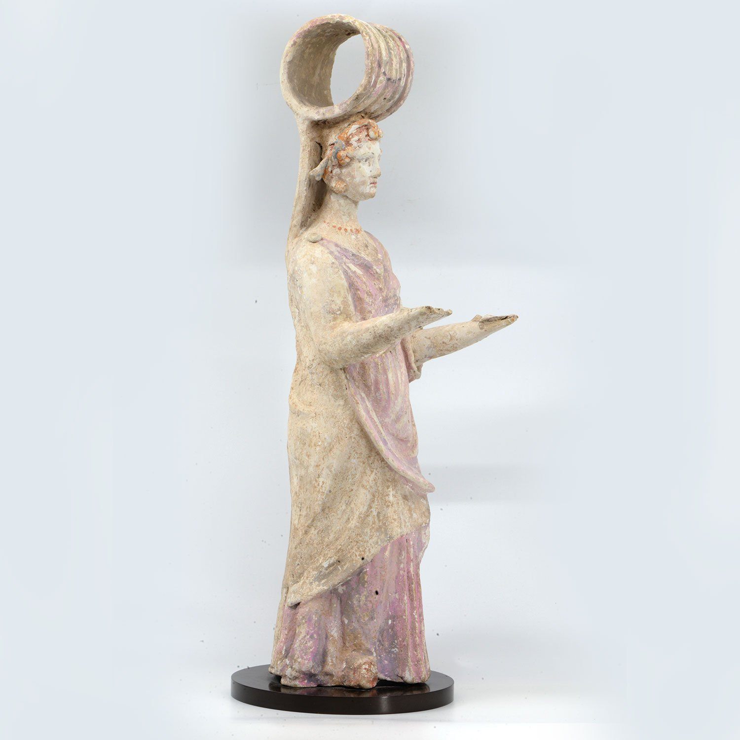 یہ خوبصورت طور پر ڈراپ والی خاتون شخصیت اپنے ہاتھوں کو پھیلا کر کھڑی پوزیشن میں لاحق ہے۔ وہ ایک لمبی ، اونچی کمر والی گلابی چٹن پہنتی ہے جو اس کے پاؤں پر نرم پرتوں میں گرتی ہے ، اور اس کے دائیں کندھے پر ایک بڑے گول بروچ سے محفوظ ہے۔ ایک ہیمیشن آہستہ سے اس کے بائیں کندھے اور بازو پر کھینچتی ہے اور اس کے جسم کے نچلے حصے کو لفافہ کرتی ہے۔ اس کا میٹھا انڈاکار چہرہ پیلا ہے۔ چھوٹے منہ کے ہونٹ سرخ رنگ روغن کے نشانات کو محفوظ رکھتے ہیں ، اور اس کی گول ، آرکڈ ابرو کے ساتھ انڈاکار آنکھیں اس کی نگاہوں کی لازوال گہرائی پر زور دیتی ہیں۔ اس کے سر کے اوپر آئیوی پتیوں اور پھولوں کے انتظامات کا ایک وسیع و عریض ڈیم ہے۔ وہ گہری سرخ رنگوں میں گول موتیوں کا ہار پہنتی ہے ، جس میں شاید کارنیلین کو دکھایا گیا ہے۔