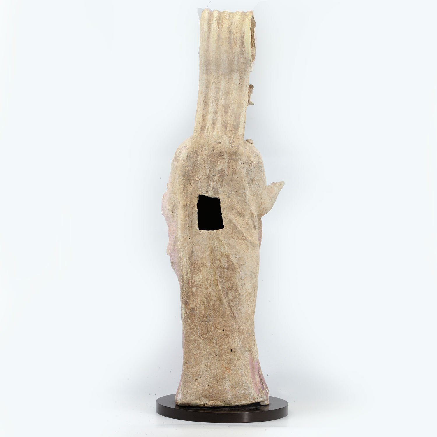 ایک حیرت انگیز طور پر محفوظ آبجیکٹ ، اس ٹکڑے میں زیادہ تر اصلی رنگ کا رنگ ہوتا ہے ، جس کی خصوصیات مقامی انداز کو مدنظر رکھتے ہوئے چہرے کی تفصیلات کی نازک پینٹنگ سمیت سختی سے متضاد رنگوں کی ہوتی ہے۔ پچھلے حصے سے منسلک ایک چھدم گلدان ایک مکمل طور پر آرائشی پٹا ہینڈل ہے جو چمکیلی پینٹ بھی ہے۔