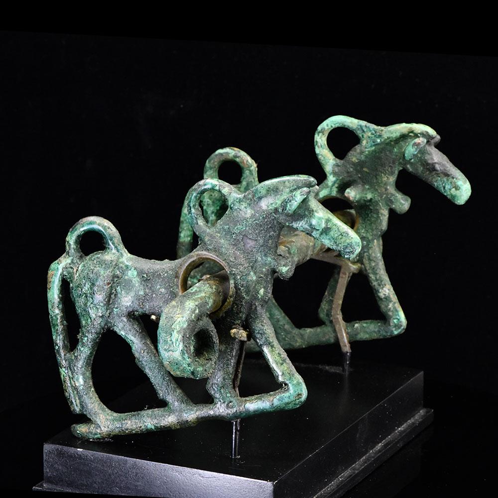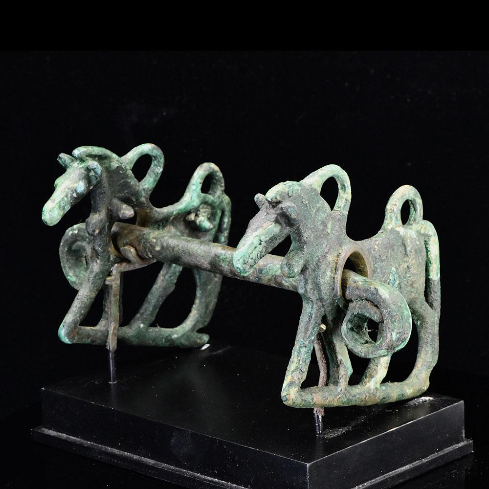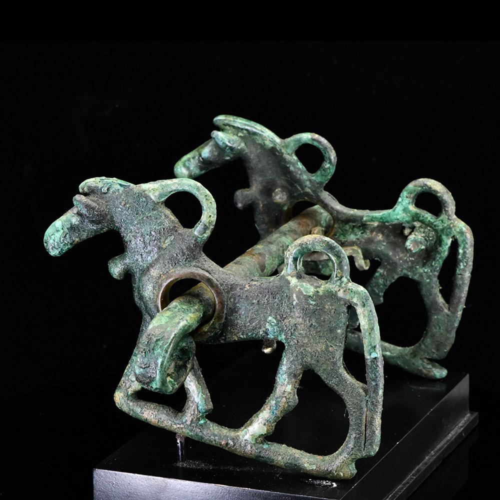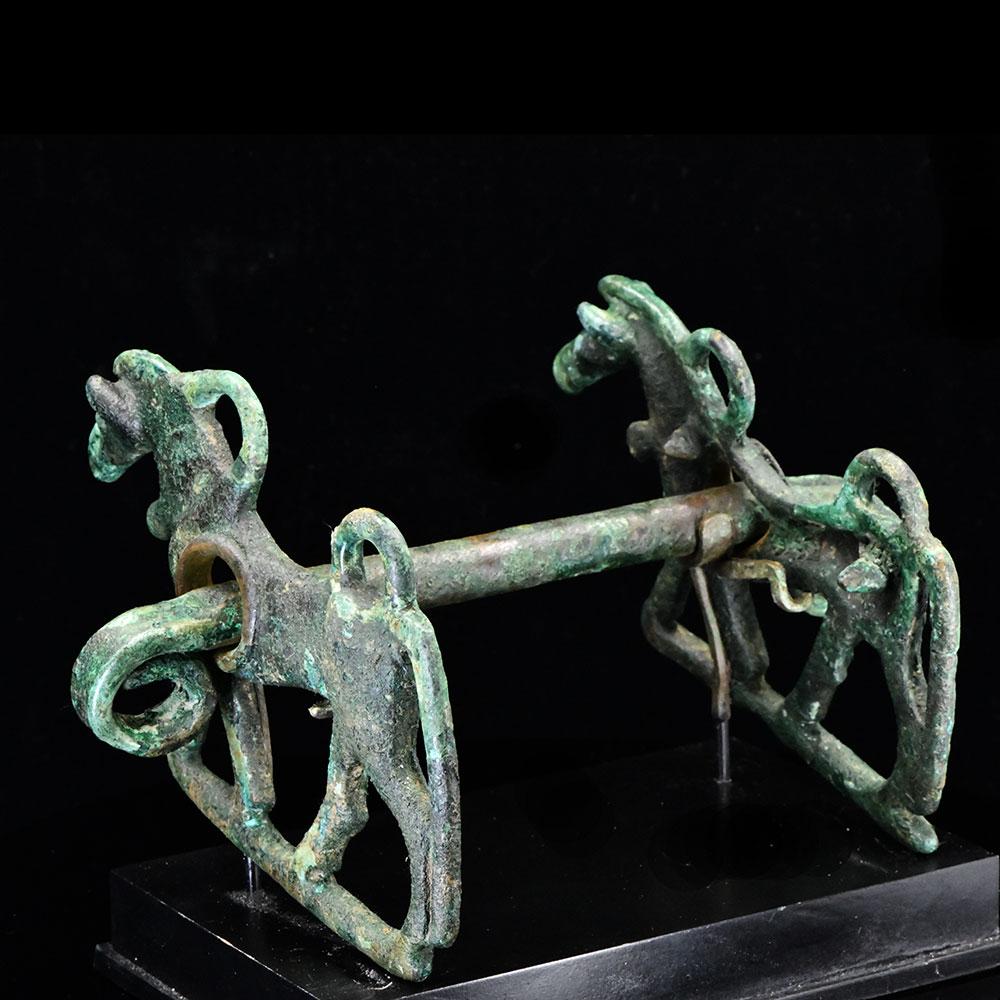 لوپ ٹرمینلز کے ساتھ ایک مربع سیکشن بار پر مشتمل ایک کانسی کا گھوڑا بٹ۔ گال کے ٹکڑے ، منہ کے ہر سرے پر ، لمبی مانیوں اور دموں کے ساتھ ، گھوڑوں کی شکل میں ڈالے جاتے ہیں ، اور ملحق کے ل two دو لوپ رکھتے ہیں۔