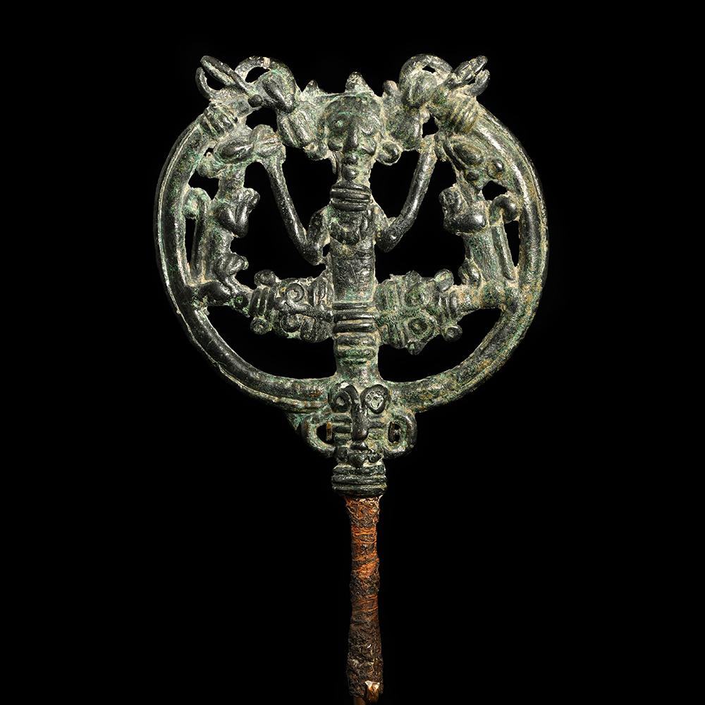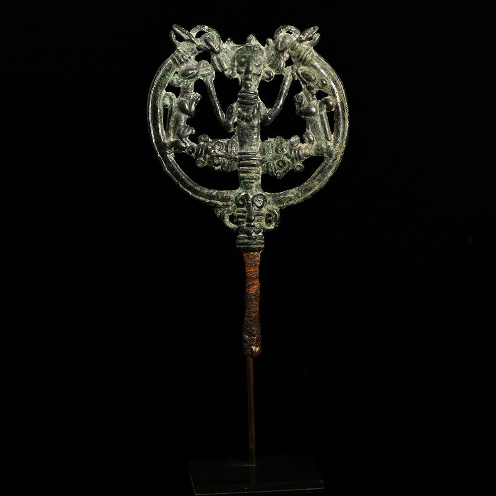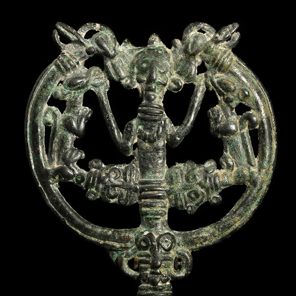 یہ اوپن ورک پن ، کھوئے ہوئے ویکس کے عمل سے کاسٹ کیا گیا ہے ، اس میں جانوروں کے ایک ماسٹر کو دکھایا گیا ہے جس میں بازوؤں کے ساتھ ہیڈ ڈریس اور پسلی والا کالر پہنے ہوئے ہیں ، جس میں دو الٹی شیروں نے فلینک کیا ہے ، جس میں اعداد و شمار کی بنیاد پر شیر ماسک سے نکل کر ایک ہلال میں کھڑا کیا گیا ہے اور پسلی والے کالروں کے ساتھ کیپرڈ سروں کے ایک جوڑے میں ختم کرنا۔