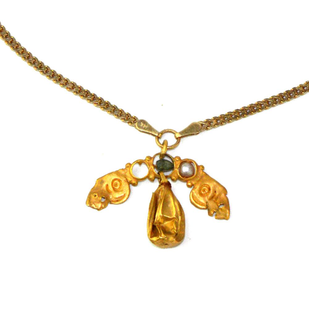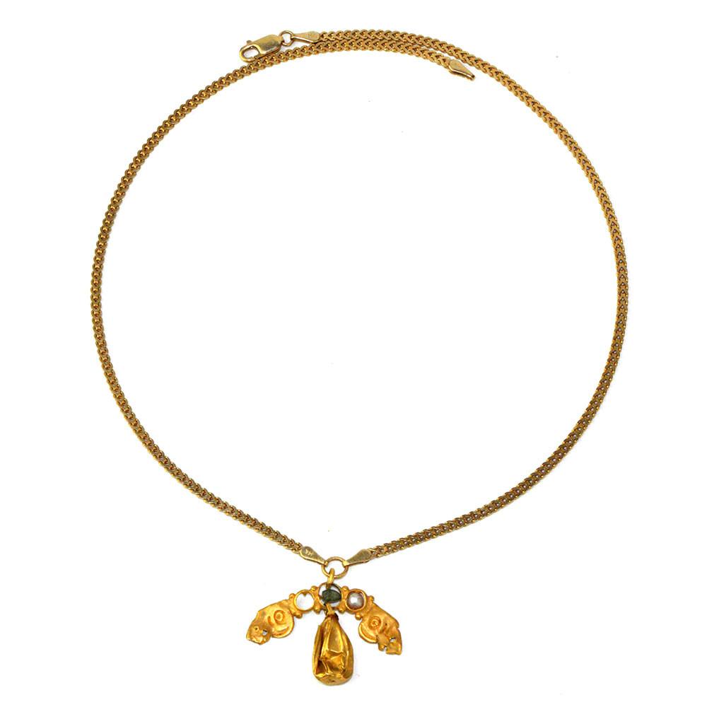 اعلی کیریٹ سونے کا ، نیم سرکلر ہتھیاروں کے ساتھ مرکزی طور پر ہلکے زمرد کے ساتھ ، ایک ساکٹ ، دونوں طرف سے اصل موتی کے ساتھ اب بھی انیٹ ، اور اسٹیمپڈ سرکلر شکل سے سجایا گیا ہے جو اسٹائلائزڈ جانوروں کے سروں سے ختم ہوتا ہے ، نیچے سونے کے آنسو ڈراپ سونے کا لاکٹلاکٹ کو بعد میں 14 کلو فلیٹ گولڈ چین پر خوبصورتی سے پیش کیا گیا ہے۔
