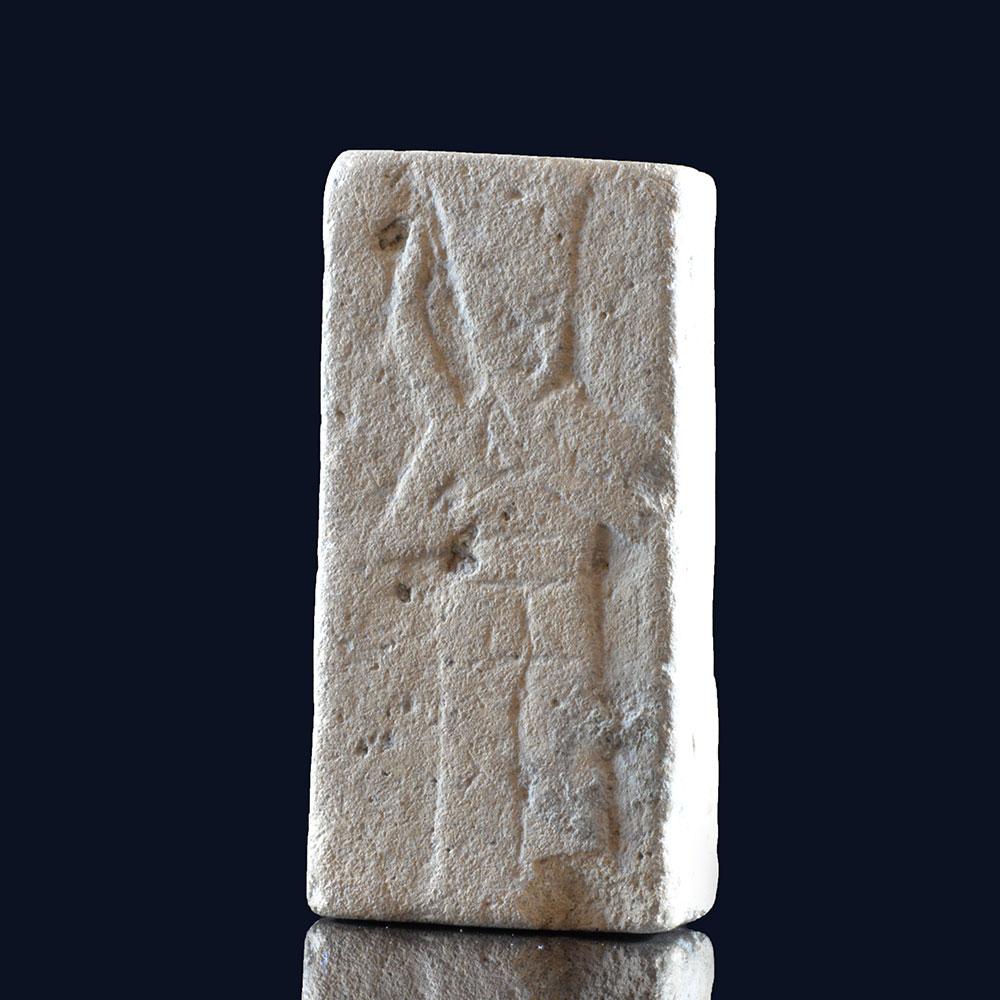 پیلا گلابی چونا پتھر سے کھدی ہوئی یہ نایاب اور غیر معمولی چھوٹی تختی موٹی آئتاکار شکل کی ہے۔ محاذ پر ، اٹھائے ہوئے راحت میں ہلکے سے کھدی ہوئی ایک فینیشین مرد دیوتا کی کھڑی شخصیت ہے ، شاید خدا کی بعل ، اپنے دائیں ہاتھ میں گرج چمک کے ساتھ برانڈ کرتی ہے۔ ریورس فینیشین اسکرپٹ کی تین لائنوں کے ساتھ بھڑکا ہوا ہے۔