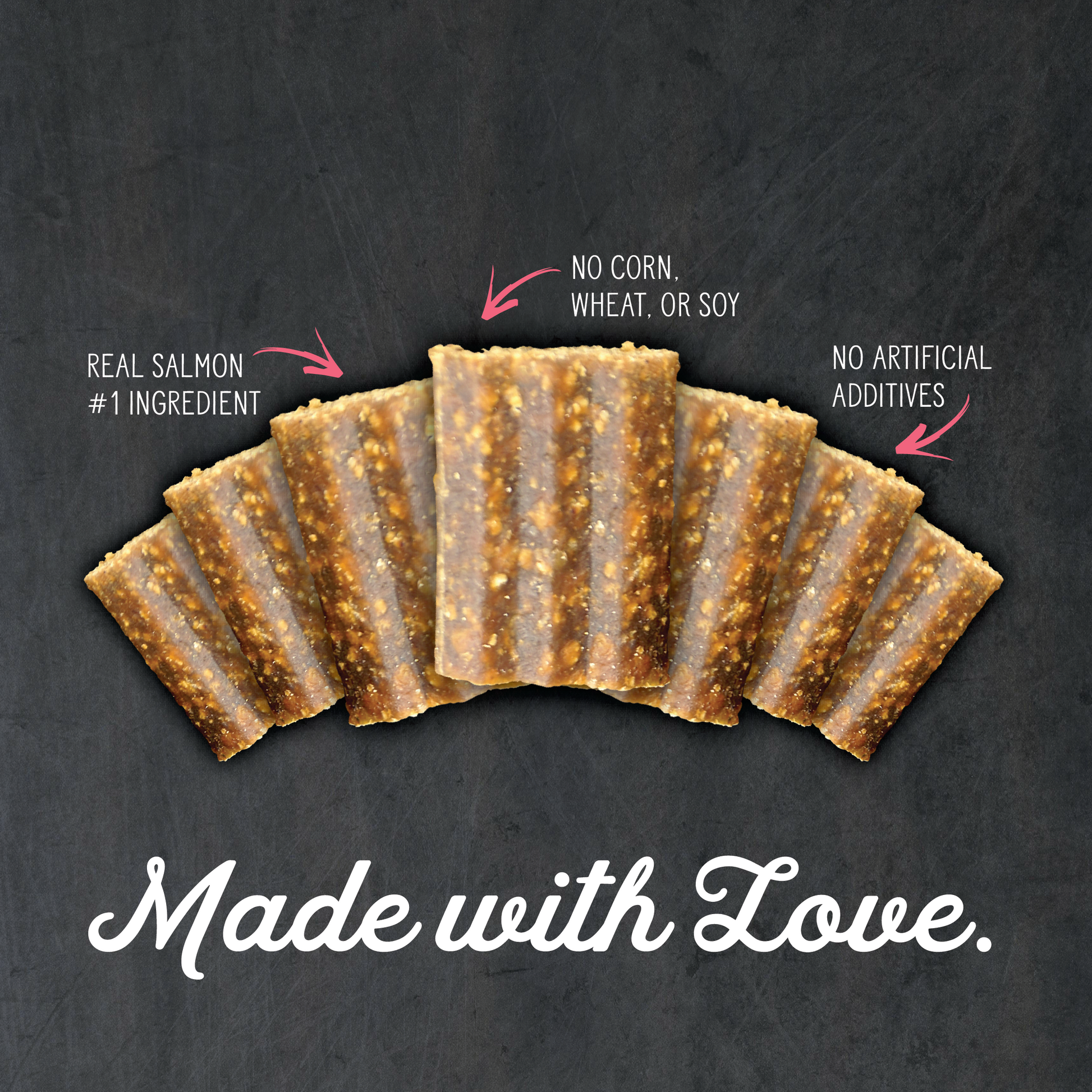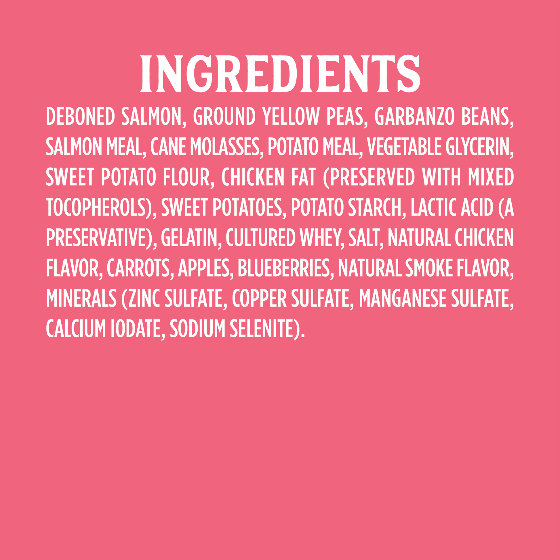 ڈیبونڈ سالمن ، گراؤنڈ پیلے مٹر ، گربنزو پھلیاں ، سالمن کھانا ، گنے کے گڑ ، آلو کا کھانا ، سبزی گلیسرین ، میٹھے آلو کا آٹا ، مرغی کی چربی (مخلوط ٹوکوفیرولس کے ساتھ محفوظ) ، میٹھے آلو ، آلو نشاستے ، لییکٹک ایسڈ (جیلیٹین) ، جیلیٹین ، ، جیلیٹین ، مہذب چھینے ، نمک ، قدرتی چکن کا ذائقہ ، گاجر ، سیب ، بلوبیری ، قدرتی دھواں کا ذائقہ ، معدنیات: (زنک سلفیٹ ، تانبے کے سلفیٹ ، مینگنیج سلفیٹ ، کیلشیم آئوڈیٹ ، سوڈیم سیلینائٹ)۔