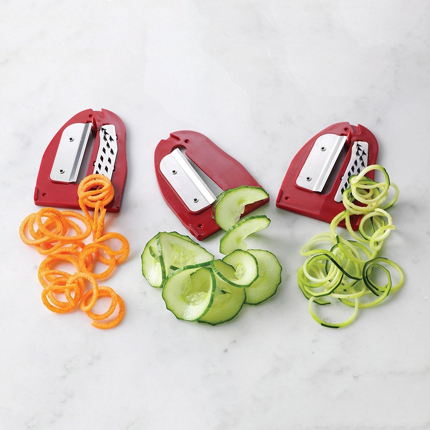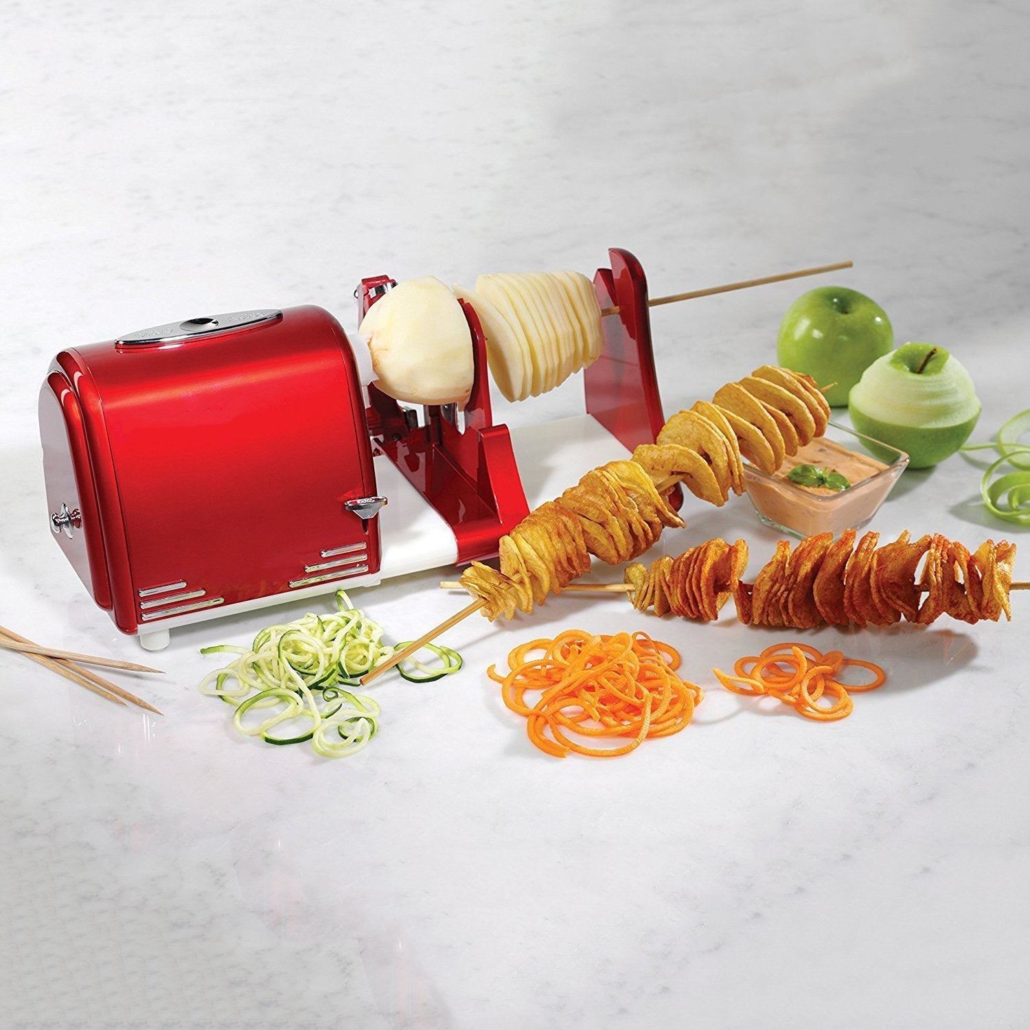 یہ چھلکے ہوئے ، اسپلڈ اور کٹے ہوئے ناشتے کی ایک بھیڑ سے لطف اندوز ہونے کے لئے بہترین ہے جو پورا خاندان لطف اٹھائے گا۔ تین مختلف کاٹنے والے بلیڈ شامل ہیں۔ پیاز کے تنکے اور زچینی نوڈلز کو جلدی سے بنانے کے لئے چھوٹے اور درمیانے درجے کے کٹوتی والے بلیڈ آزمائیں ، سرپل بلیڈ کے ساتھ چھڑی پر اسپلڈ باربیکیو آلو کے چپس بنائیں ، یا چھلکے والے بلیڈ کے ساتھ ایک سیب کو چھلکا کریں۔