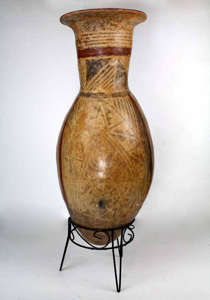 رنگوں میں سجایا گیا بڑے انتھروپومورفک اسٹوریج جار اس ثقافت کی زندگی کی نمائندگی کرتے ہیں: سورج کی کثرت کے لئے پیلا ، انسان کے اندر زندگی کے گہرے سرخ رنگ کے پس منظر کے خلاف عقلمند اور خاموش رات کے لئے سیاہ۔ شیورون کا ایک نمونہ نچلی سطح پر ہے ، اگلی سکرولنگ لہریں ، مڈ سیکشن میں مندر کا ڈیزائن ، اور کندھے پر سورج اور کرنیں۔