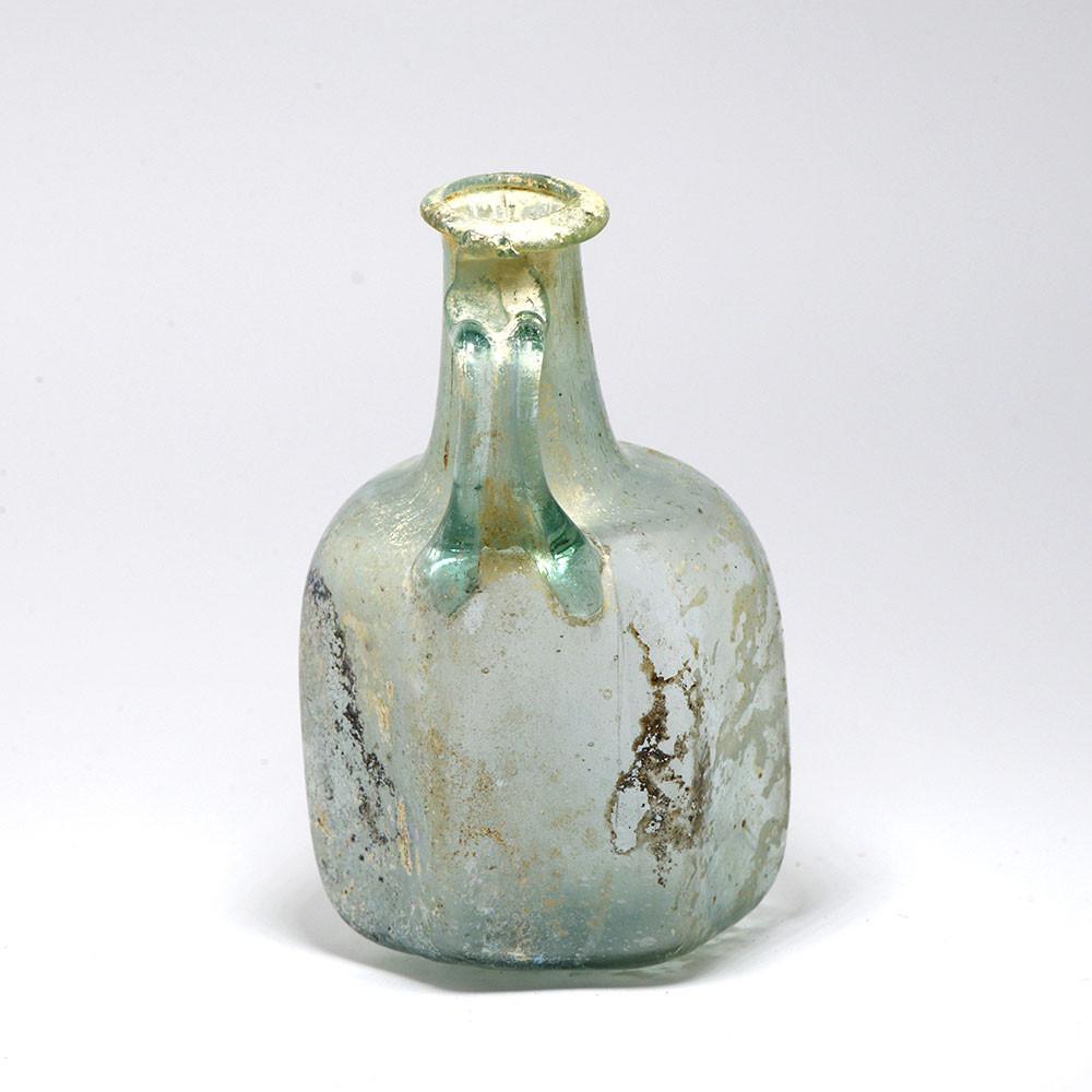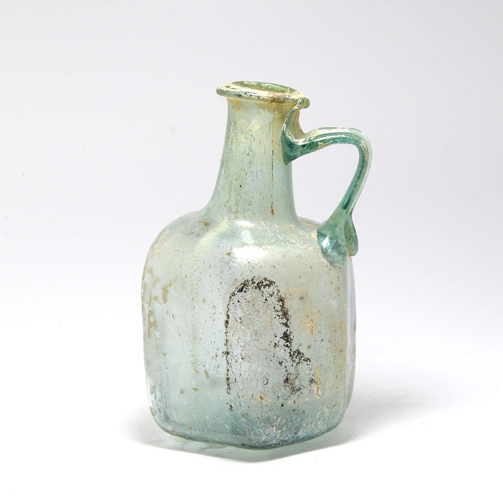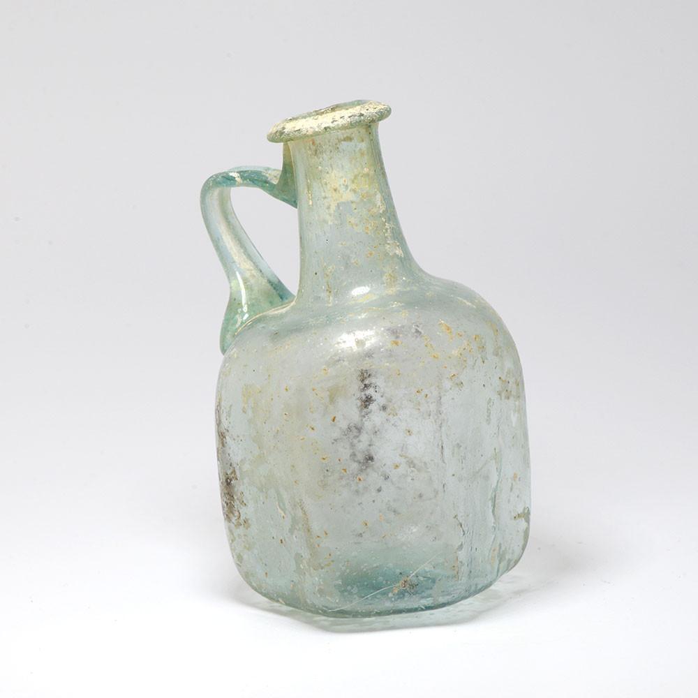 اس چھوٹے برتن کا پتلا اڑا ہوا گلاس پہلی صدی کے کاریگر کی مہارت کو ظاہر کرتا ہے۔ پیلا نیلے رنگ کے شیشے میں سے ، ہیکساگونل جسم کو جھکا ہوا گردن کے ذریعہ بیرونی بھڑک اٹھنے والے کنارے اور مبہم نیلے/سبز گلاس کے پٹا ہینڈل کا اطلاق کیا جاتا ہے۔