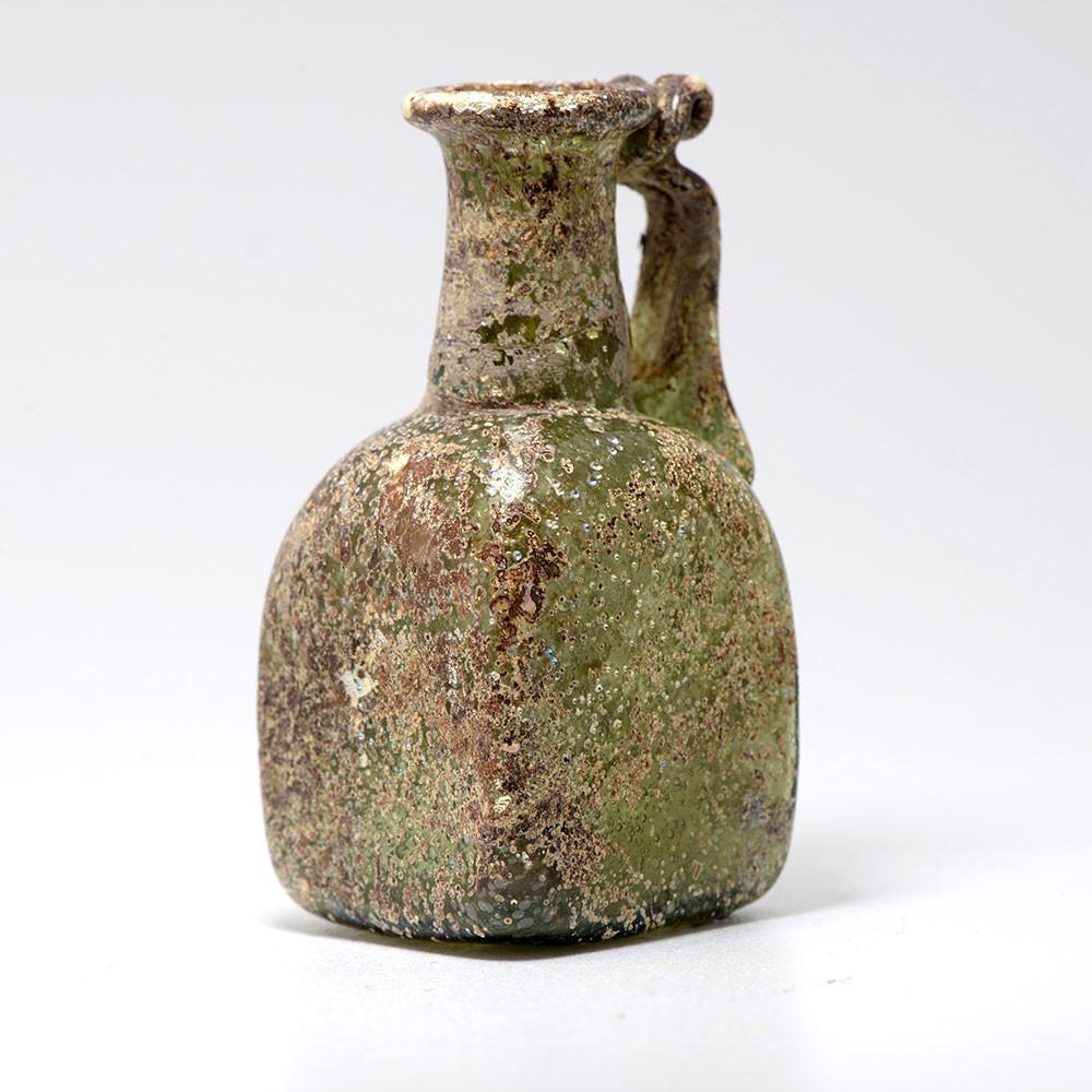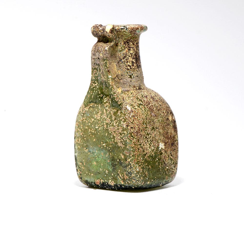 حالت:اس بوتل میں موسمی اور معدنیات کی کمی ہوتی ہے اور اس قسم کے شیشے کے بہت سے برتنوں کی طرح ، گلاس قدرتی طور پر بکھرے ہوئے پیلا iridecence کے ساتھ پارباسی ہوتا ہے۔  گردن میں ایک چھوٹا سا شگاف ہے اور دوسرا اڈے تک ، بصورت دیگر ، یہ برقرار ہے اور یہ بہت اچھی حالت میں ہے جس کے اندر اندر نظر آنے والے اصل مندرجات کے نشانات ہیں۔