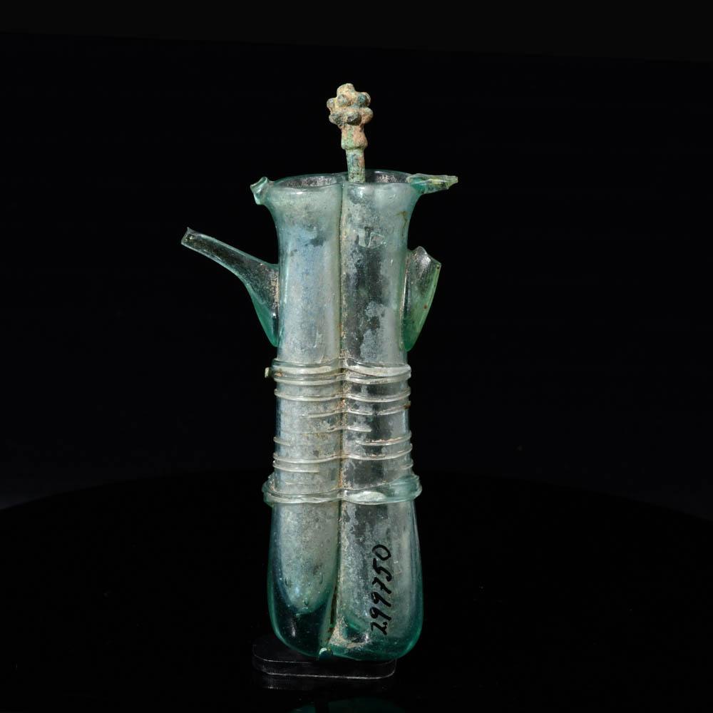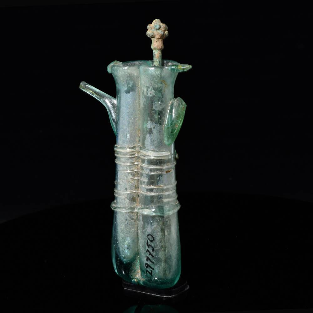 فینیشیا (لبنان) میں حاصل کیا گیا ، شیشے کے دھاگے کے ساتھ ایک ڈبل سبز گلاس فلاسک جسم کے وسط کے گرد افقی طور پر پھنس گیا۔ اطلاق شدہ ہینڈلز کے چار ٹکڑے منسلک رہتے ہیں۔ دو منہ کے دونوں طرف اور دو جسم سے تھوڑا سا راستہ ابھر رہے ہیں۔ سمتھسنین میوزیم نمبر 299750 جسم پر سیاہ رنگ میں لاگو ہوا۔