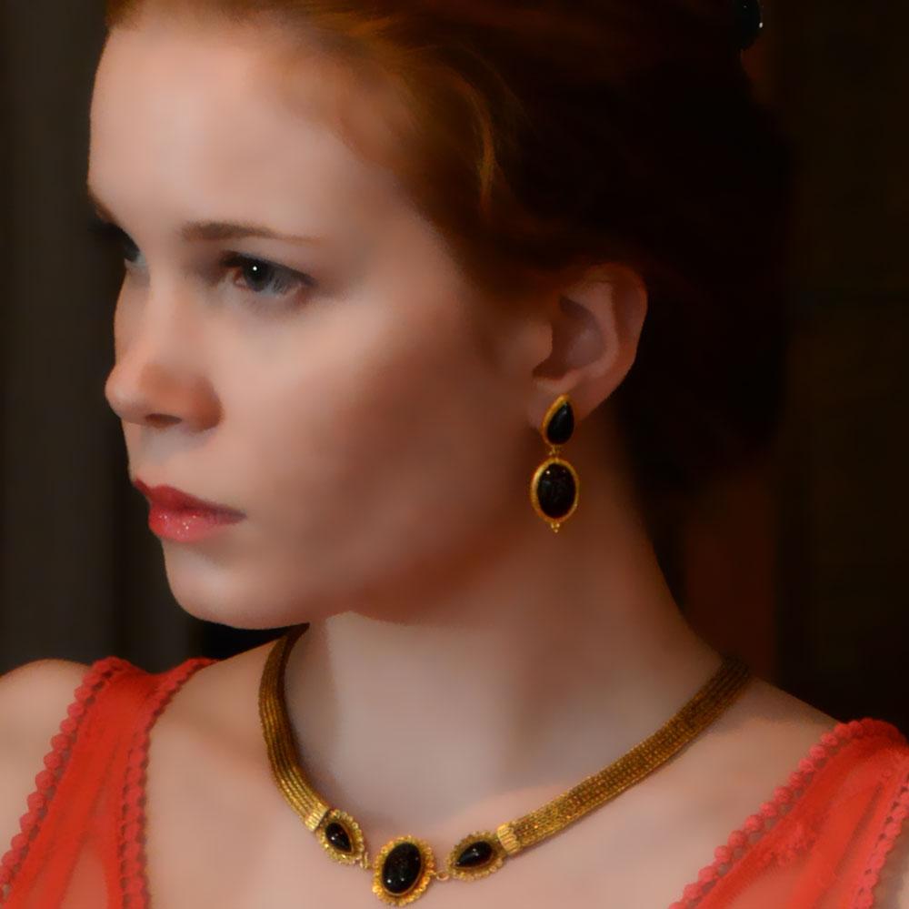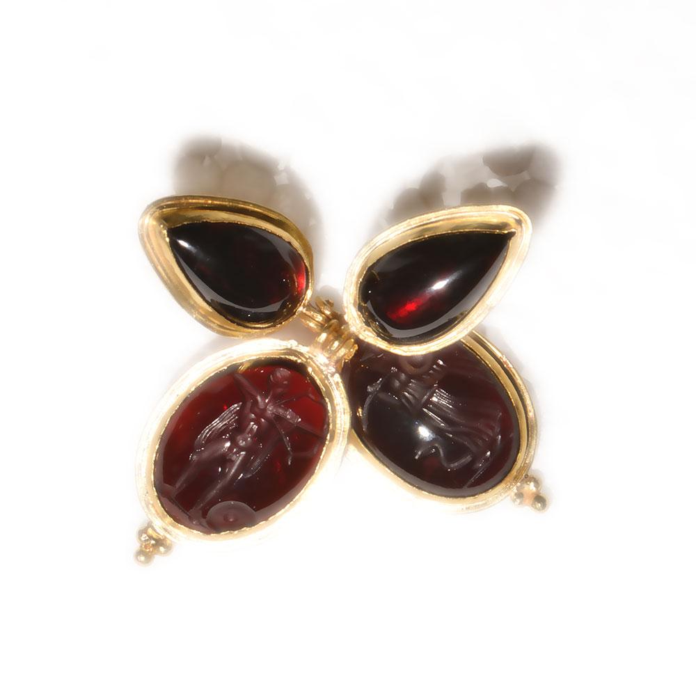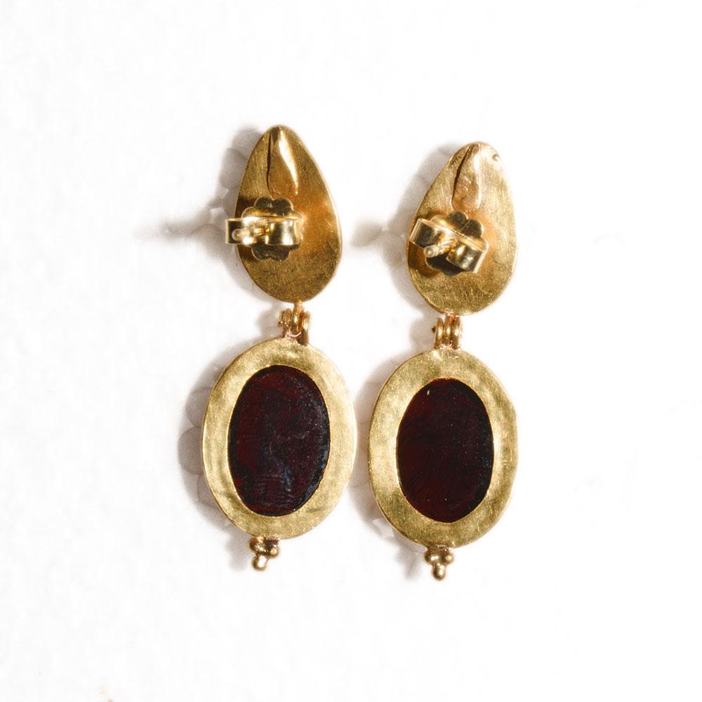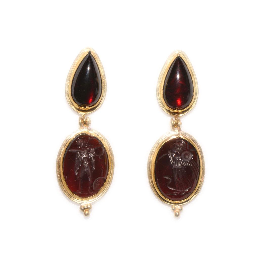 انیسویں صدی میں 18 کیریٹ سونے کی بالیاں میں رومن سے متاثرہ گارنیٹ انٹگلیو کی ایک خوبصورت جوڑی۔ انٹگلیو ، ہیلمیٹڈ ایتینا میں سے ایک ، جنگ اور حکمت کی دیوی ، اس کے نیزے اور ڈھال کے ساتھ ، ایک سانپ کے ساتھ ، دوسرا اپولو ، خدا کے فنون لطیفہ ، شفا یابی ، اور پیشن گوئی کے ساتھ ، اس کے دخش اور تیر کی پٹی کے ساتھ ، ایک ڈھال اس کے پاؤں انٹگلیو کو سونے کے بیزلز میں نیچے دیئے گئے ہیں جن کے نچلے حصے میں دانے دار کلسٹرز کے ساتھ ، سونے میں رکھے ہوئے آنسو کے ساتھ منسلک کیا گیا ہے۔