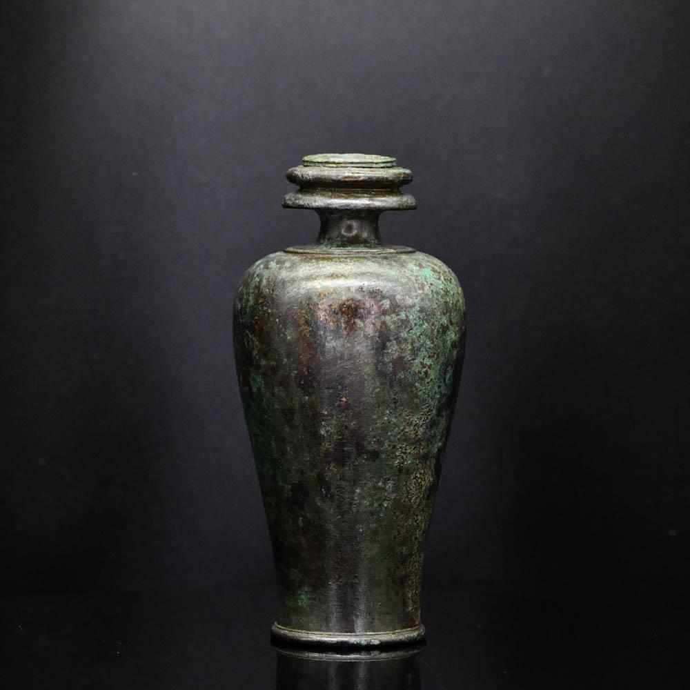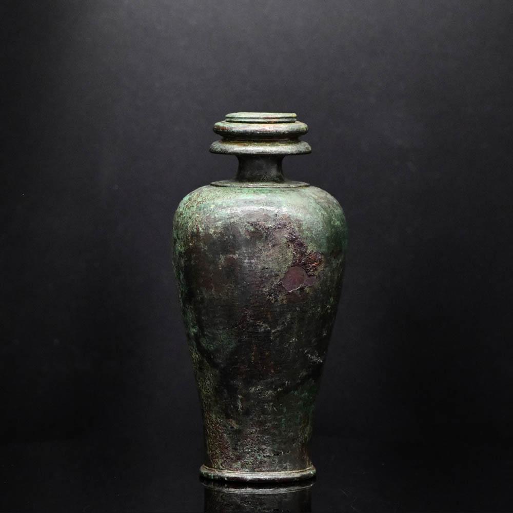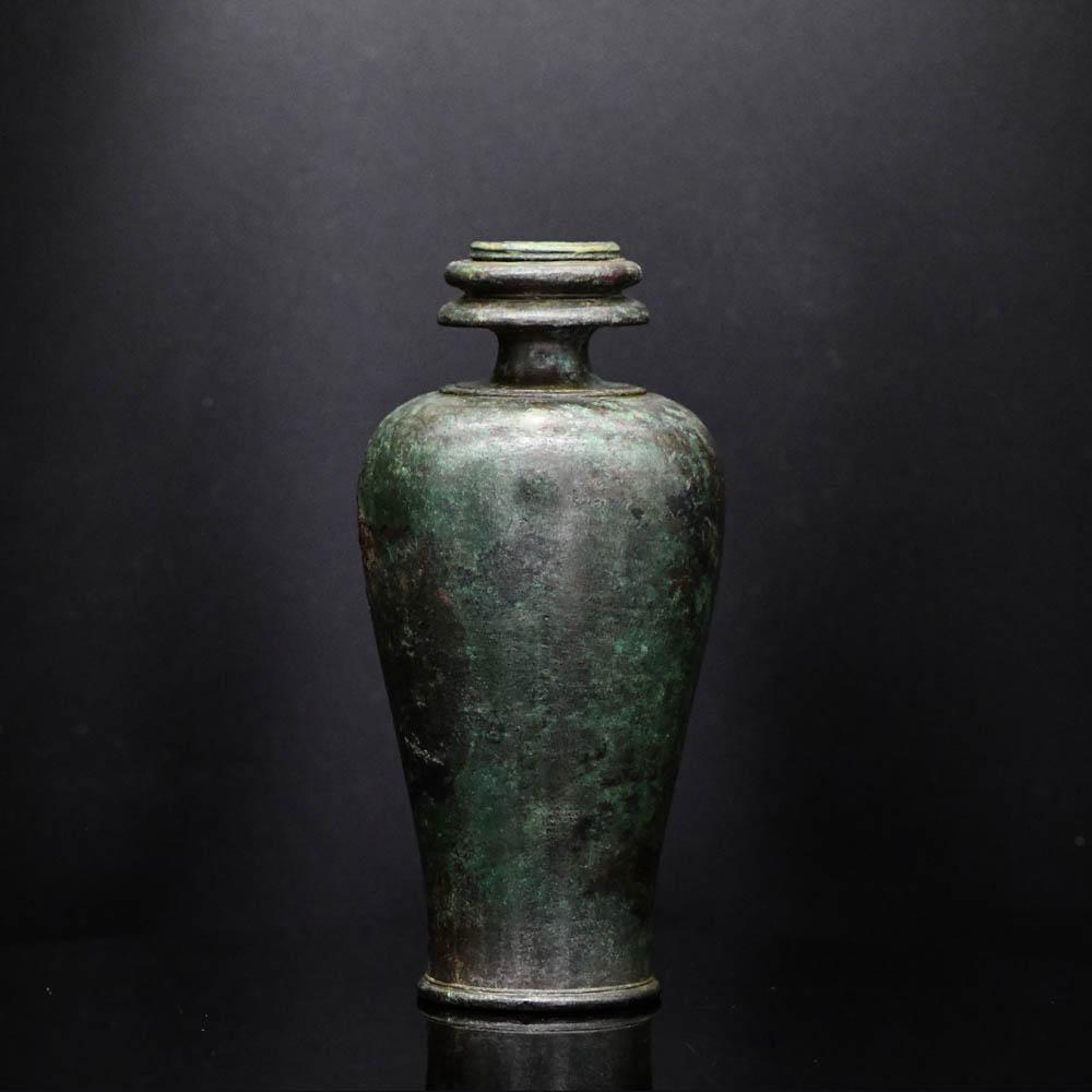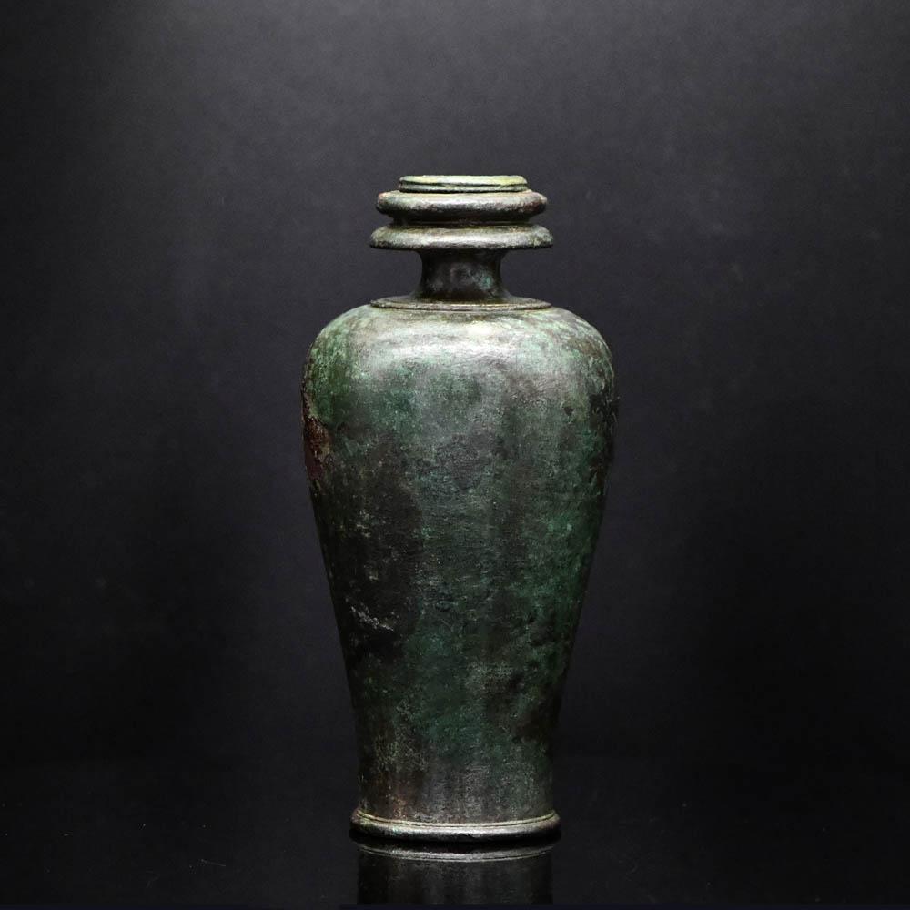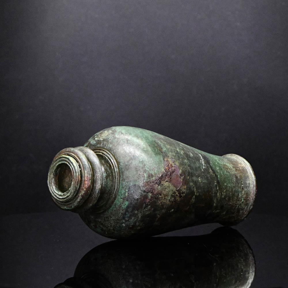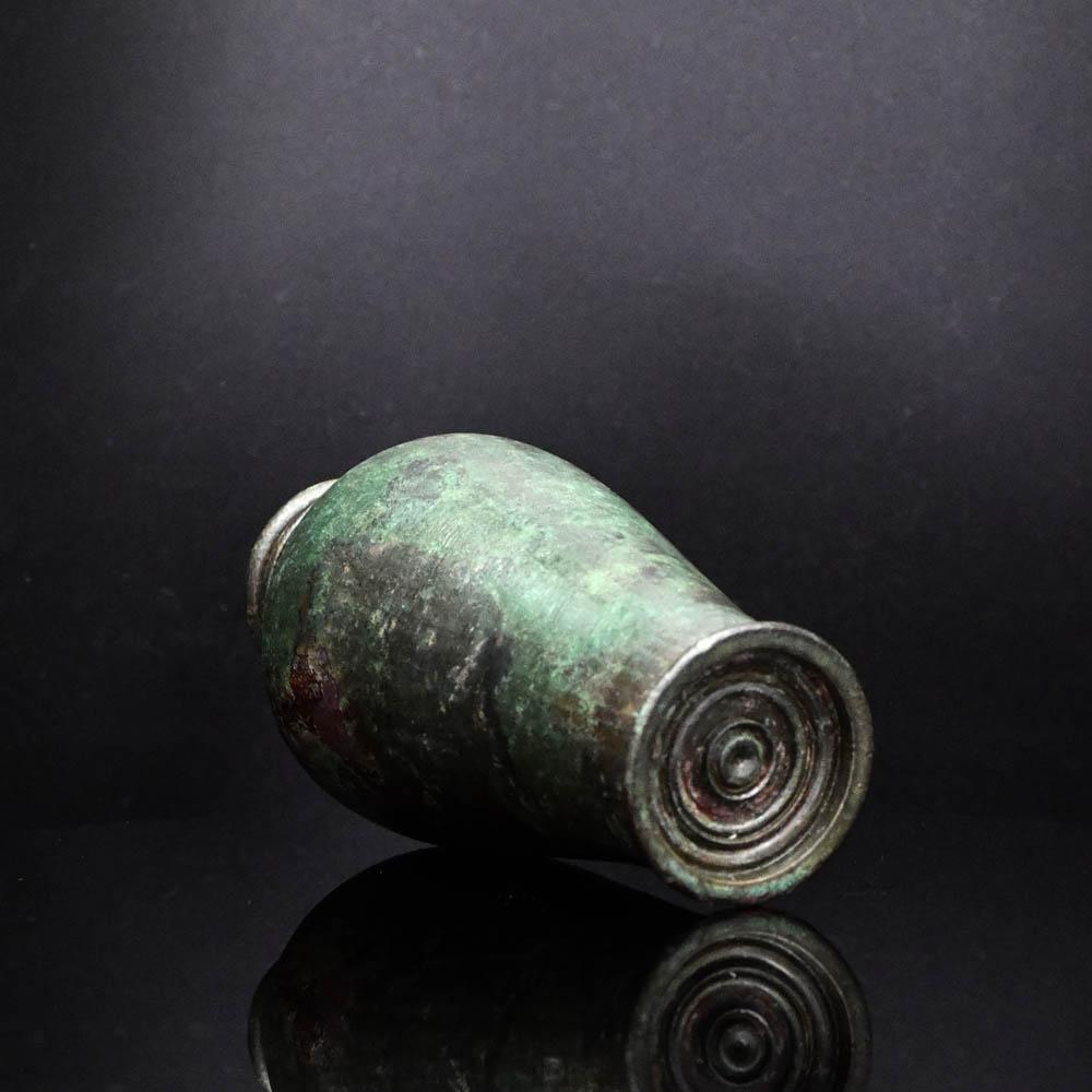 اس خوبصورت کانسی برتن کی گہری بھوری سطح جزوی طور پر ایک خوبصورت سبز پیٹینا کے ساتھ ڈھکی ہوئی ہے۔ الگ الگ کام کرنے والے عناصر سے بنا ہوا پھر جمع کیا گیا ، اس میں ایک پتلی گردن ہے جس میں کثیر سرکلڈ رم اور سرکلر بیس ہے جو دونوں کو ایک نرمی سے ٹیپرنگ جسم میں سولڈرڈ کیا گیا تھا جس کی وجہ سے کانسی کی ایک ہی چادر سے ٹکرایا گیا تھا۔
